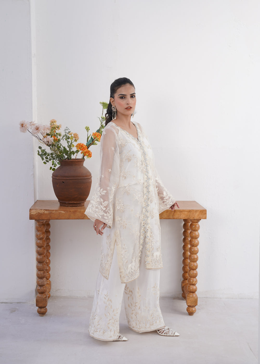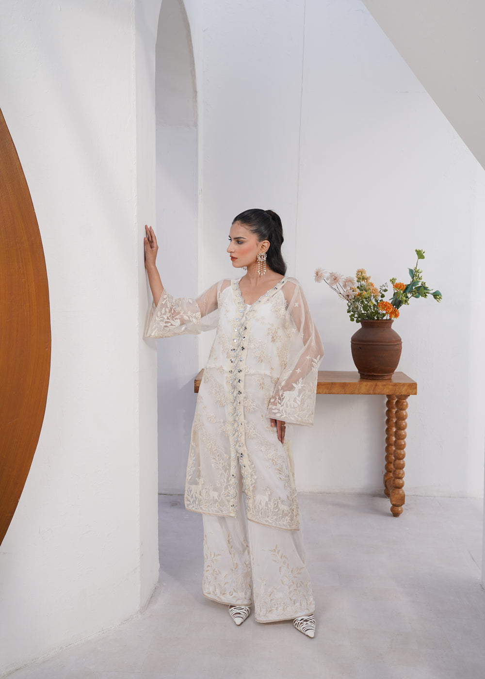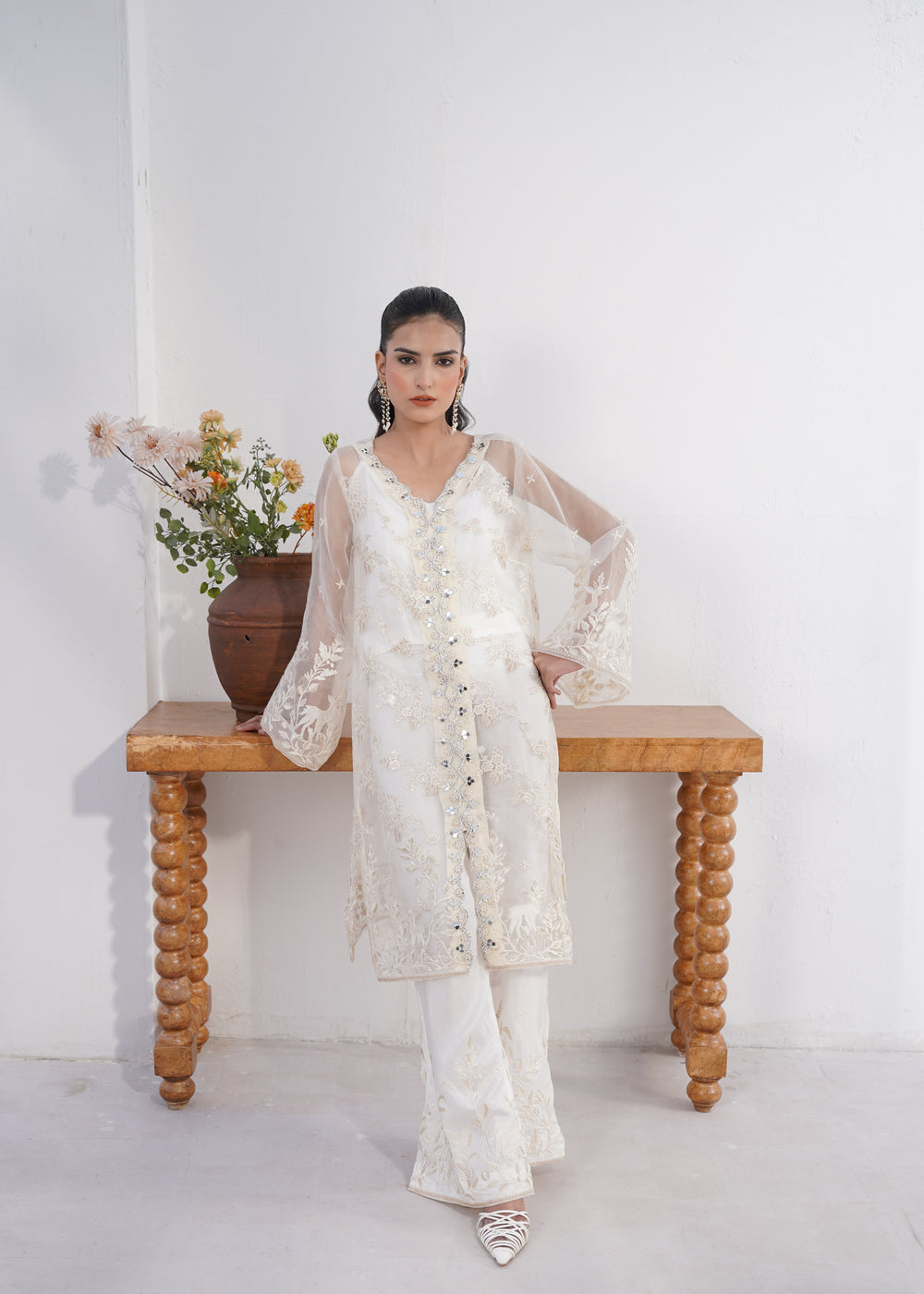 This sophisticated off-white ensemble features a delicately embroidered organza jacket layered over a beautifully handworked shirt. Designed with refined detailing, the intricate hand embellishments add depth, texture, and subtle luxury to the overall look.