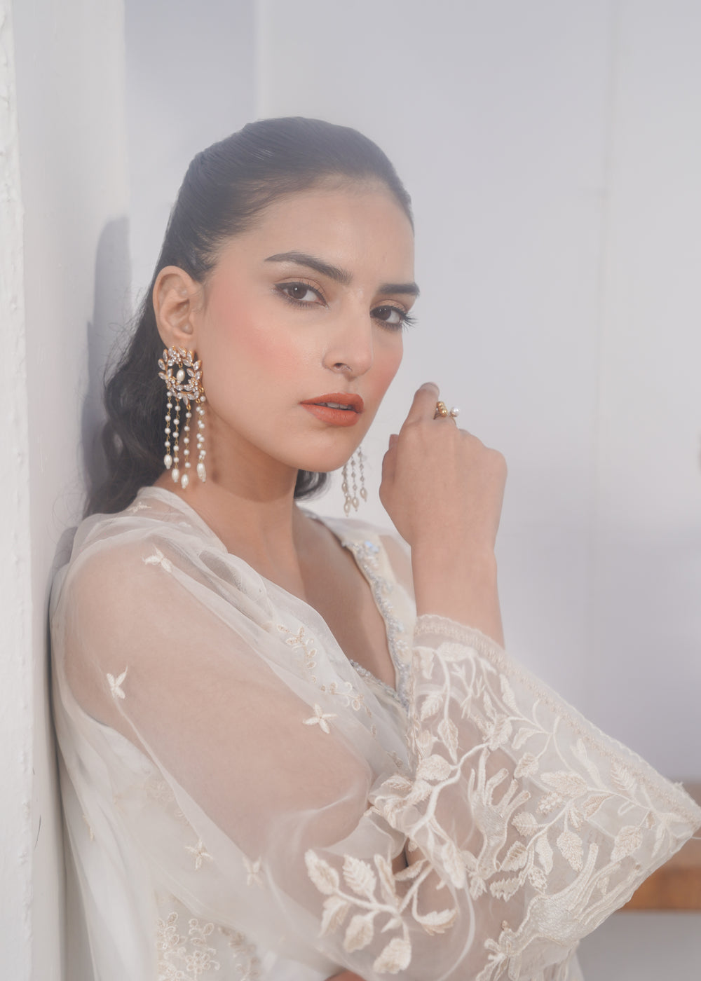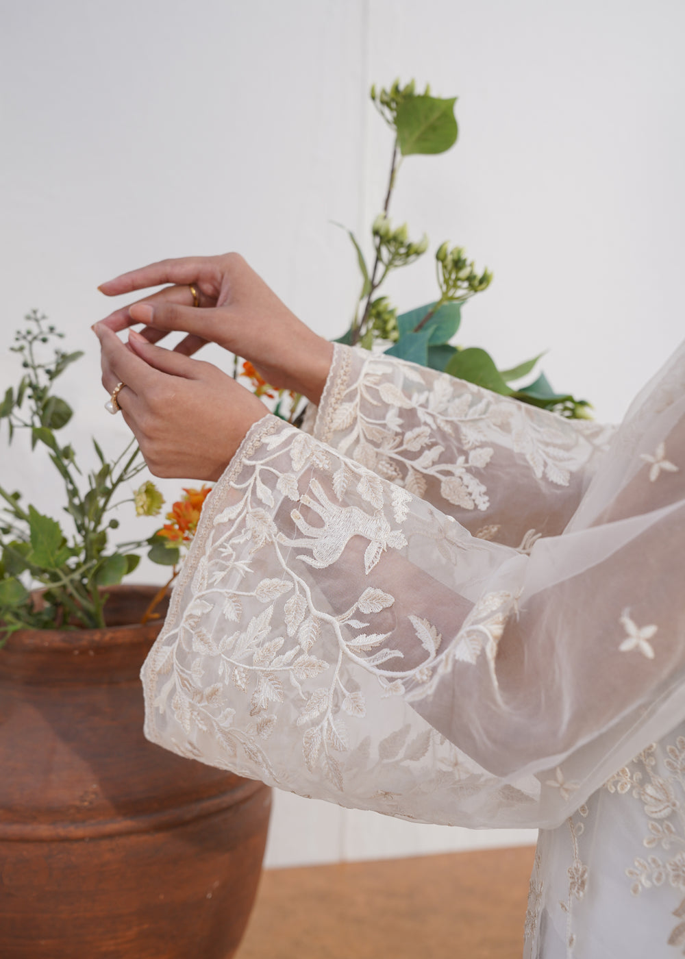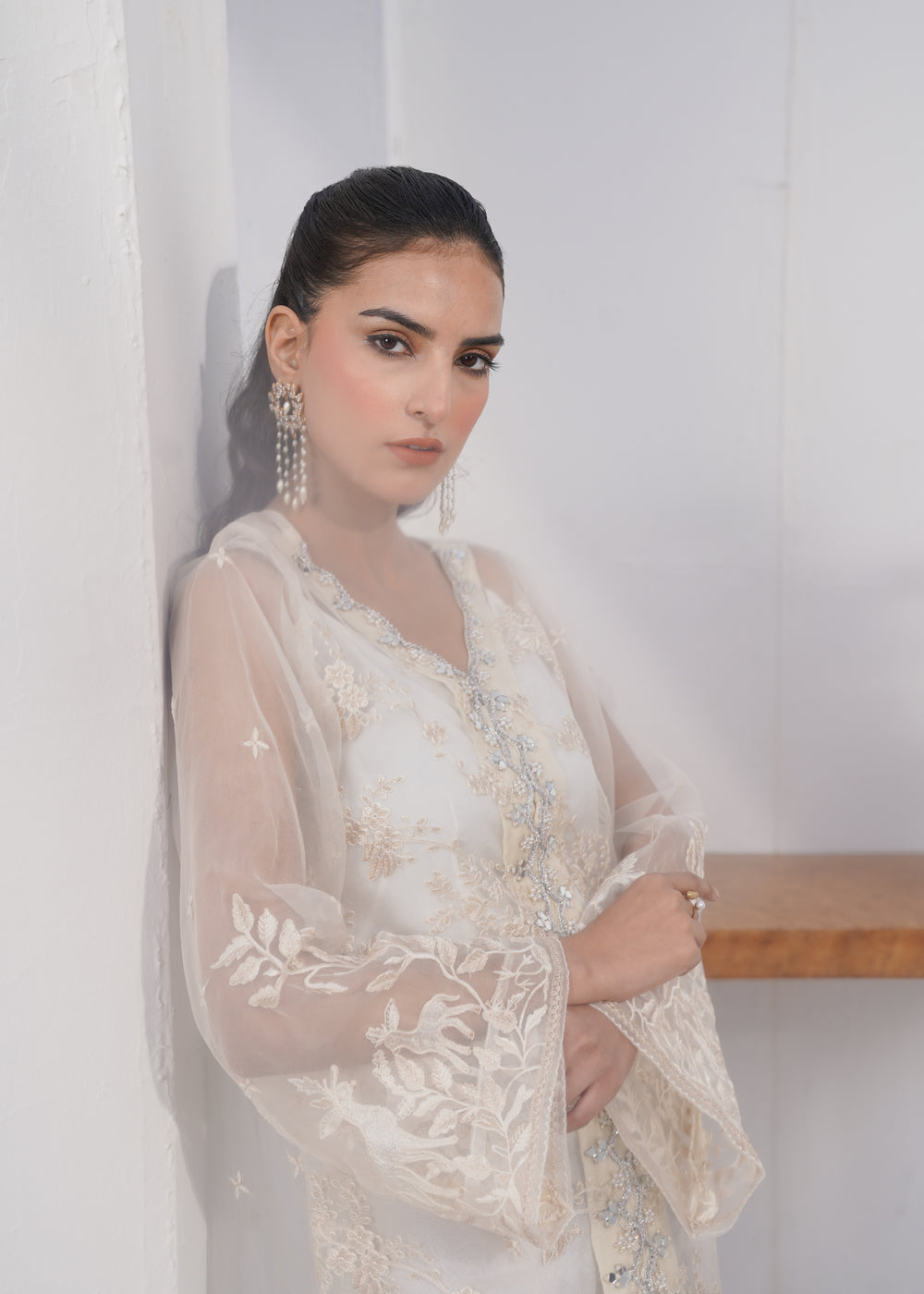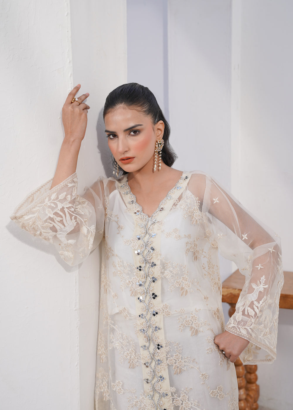 This sophisticated off-white ensemble features a delicately embroidered organza jacket layered over a beautifully handworked shirt. Designed with refined detailing, the intricate hand embellishments add depth, texture, and subtle luxury to the overall look.