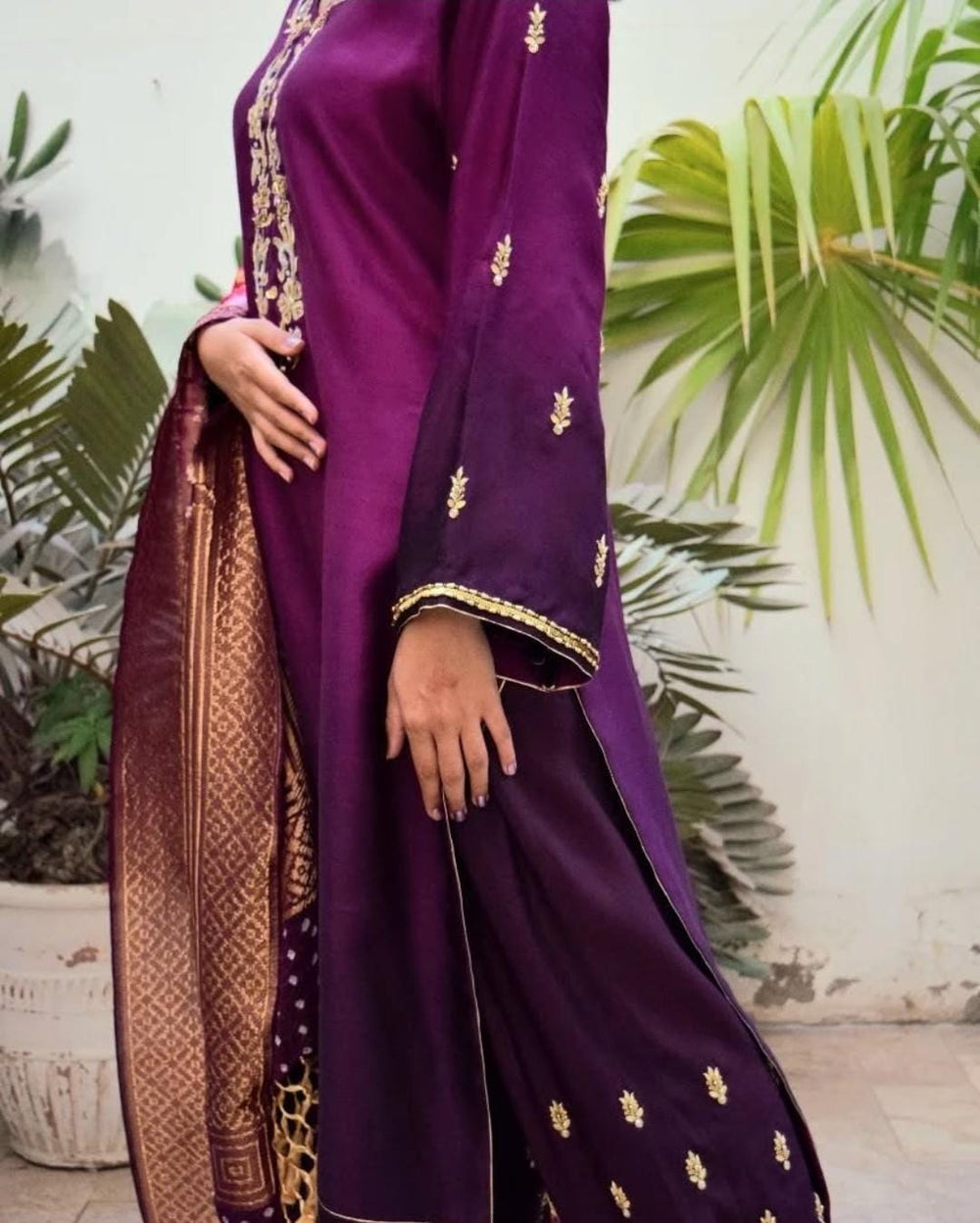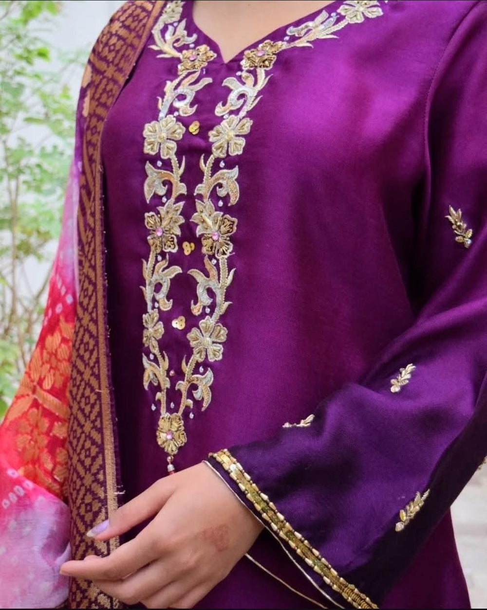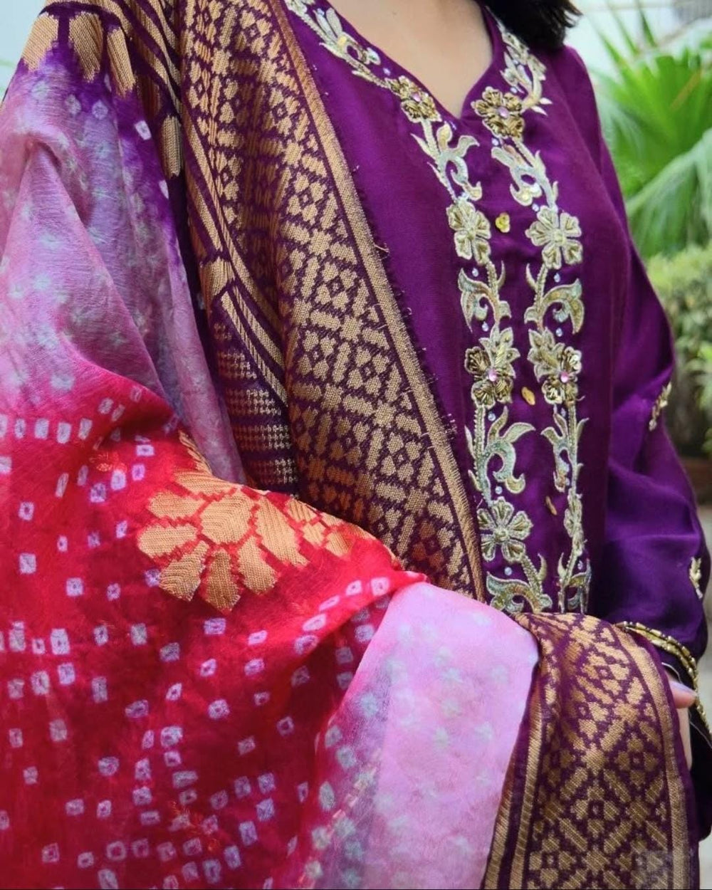This outfit is made from pure sheesha silk fabric, showcasing an elegant ombre effect on the shirt. Paired with a chiffon banarsi dupatta, it radiates timeless charm. The neckline features delicate zari embroidery, while the trouser is adorned with handwork booti details, adding intricate artistry to the ensemble.