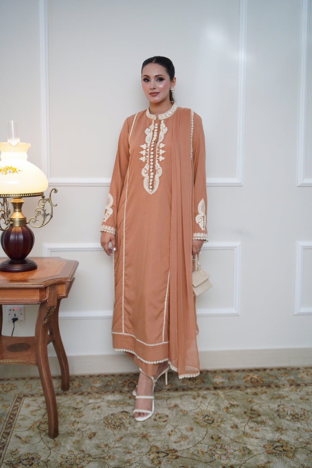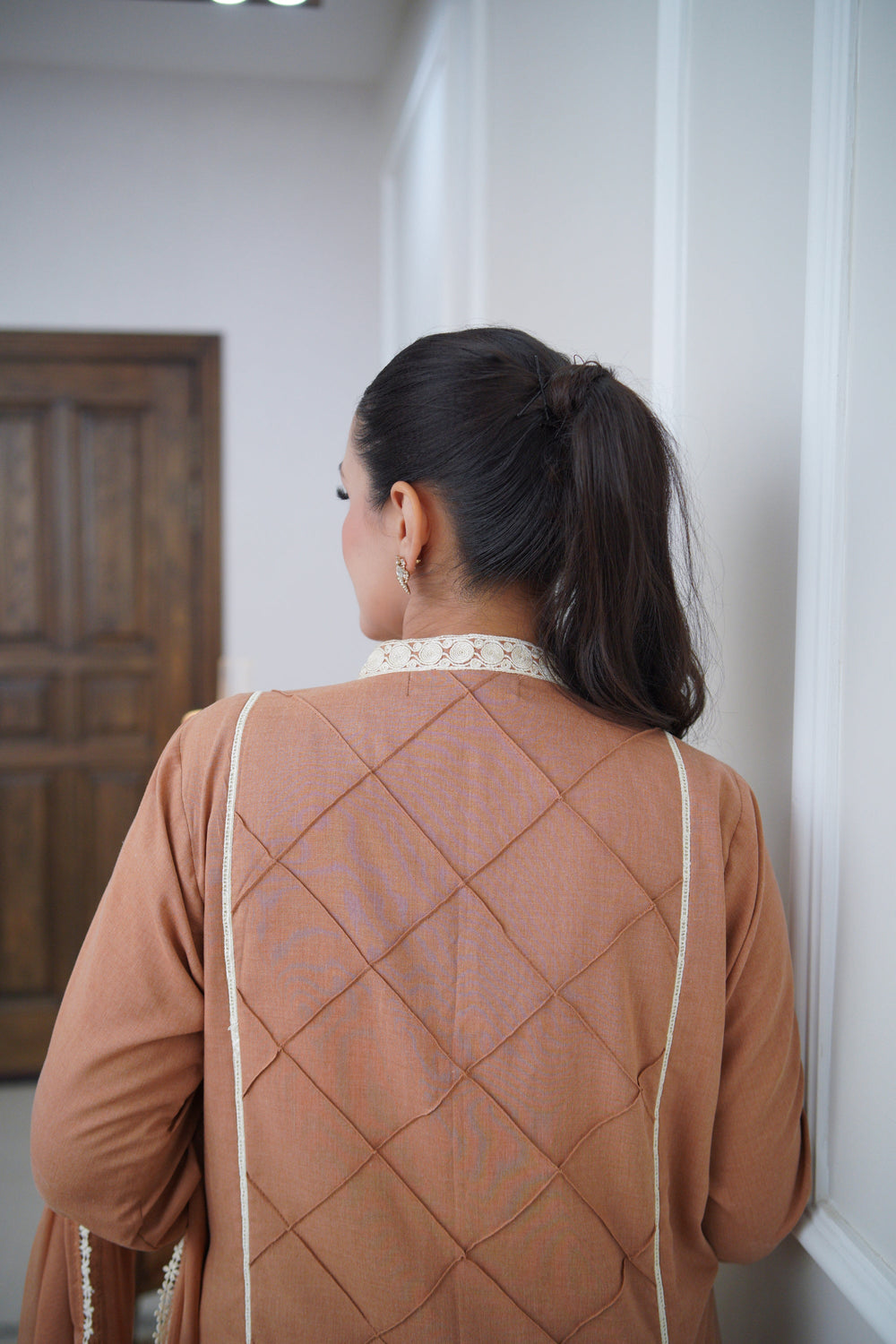 Crafted in wrinkle-free flowy cotton slub, this pumpkin peach ensemble is the perfect harmony of elegance and ease. The front features fine pintex and pleat detailing that add structure without stiffness, while the dori-embroidered neckline and matching sleeve motifs bring handcrafted charm into focus.