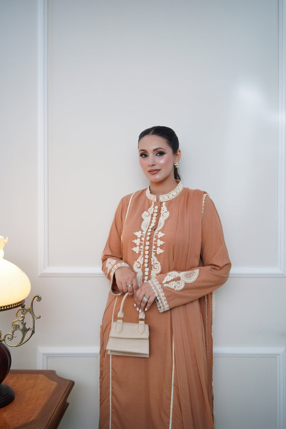 A hint of lace edges the dupatta, softening the look with subtle femininity. Finished with scalloped lace trims and a relaxed silhouette, this piece is designed for effortless grace rooted in tradition, with a contemporary soul.