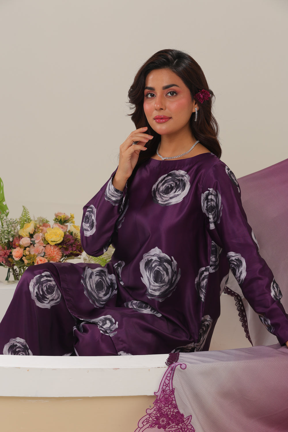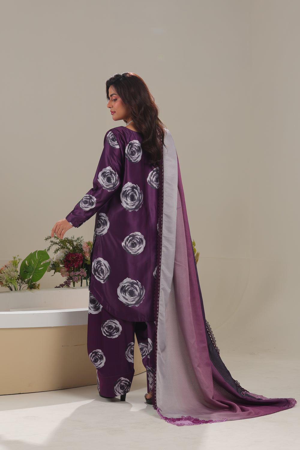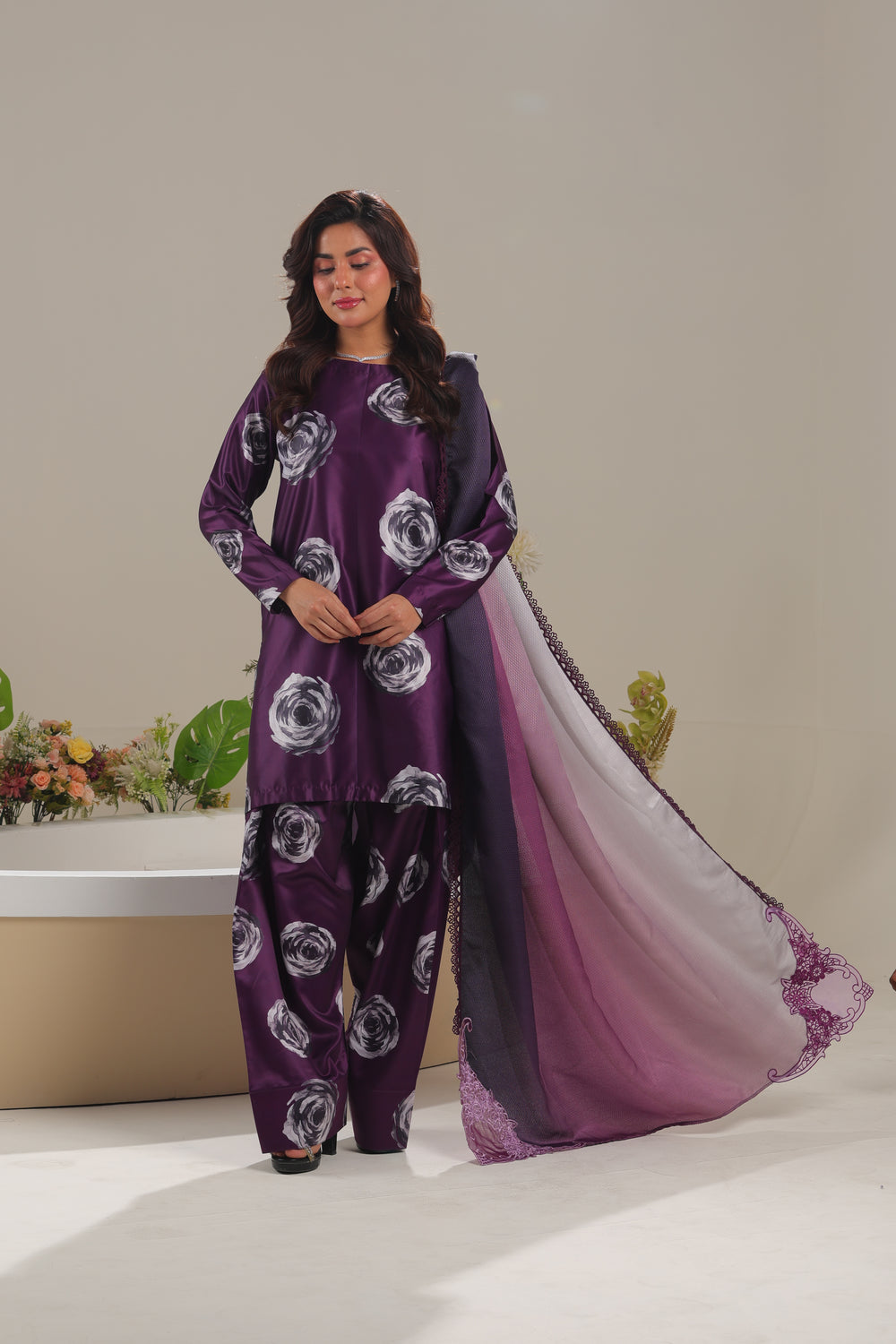 Unstitched Elevate your wardrobe with Rosae, a satin silk 3-piece suit featuring a stylish printed shirt, soft dobbie net shawl, and