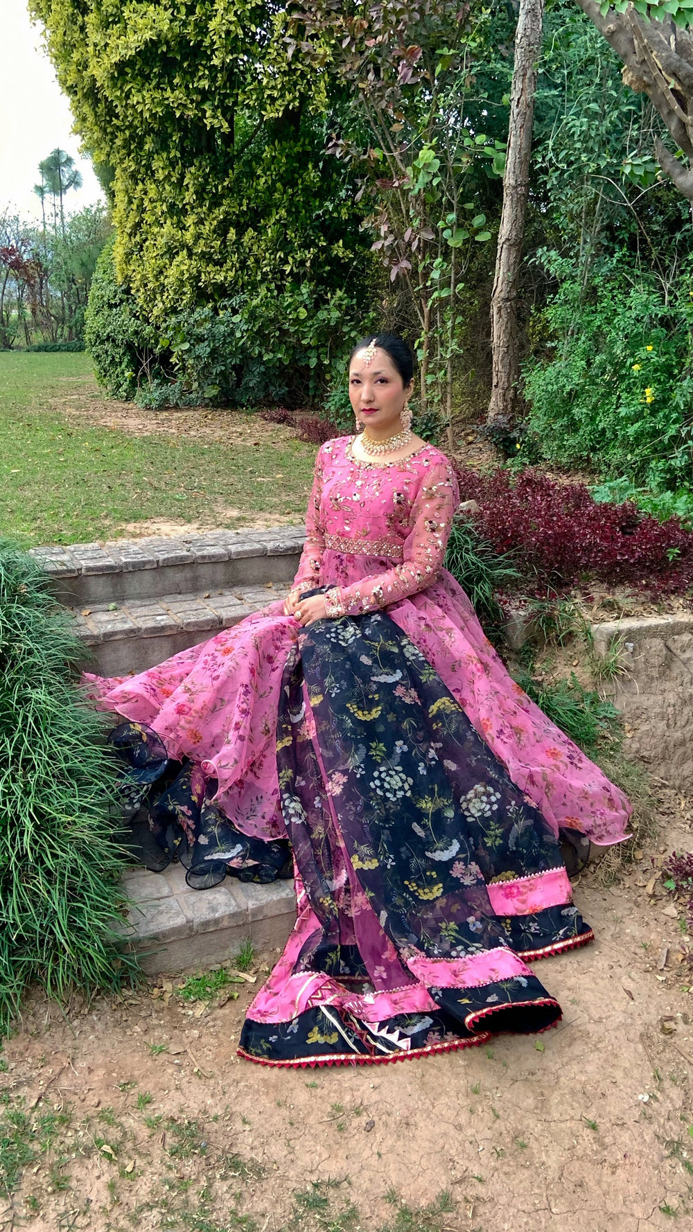 Printed organza with botanic patterns. Featuring hand embroidered zardoze metal-work, sequins, beading and silk thread (resham) on front and back of bodice, as well as the full-length sleeves. A floral border decorates the neck, cuffs and keyhole at the back. Peshwas features a billowing double skirt with contrasting black ruffles. Pair with printed black organza dupatta with pink borders, and gota and lace embellishments.