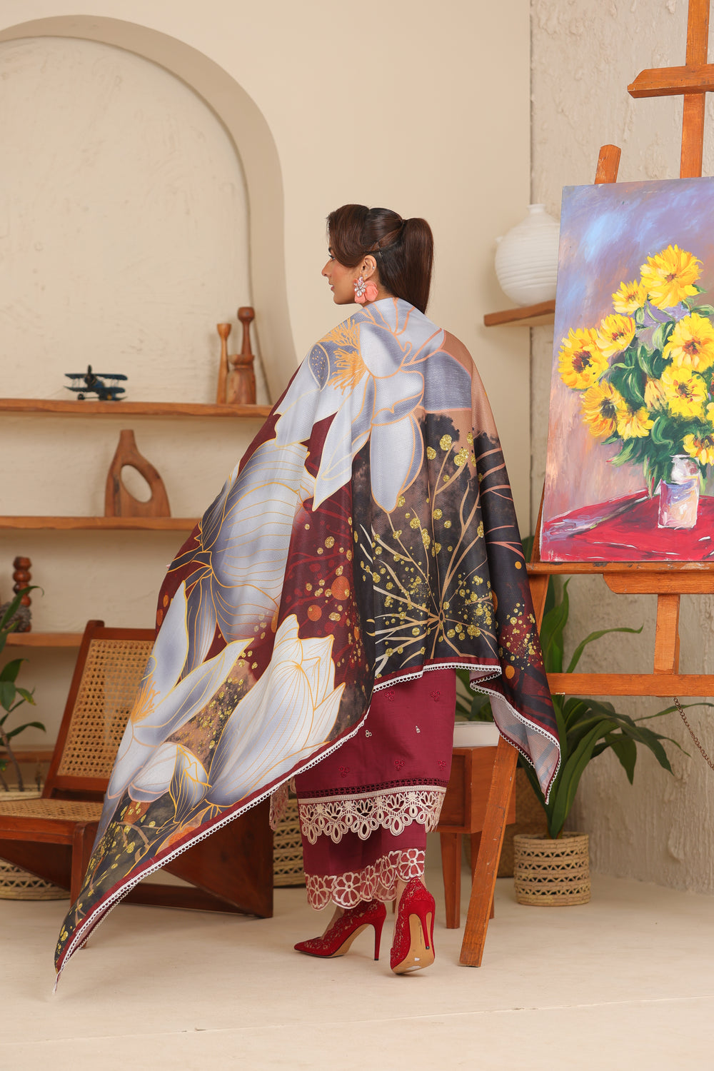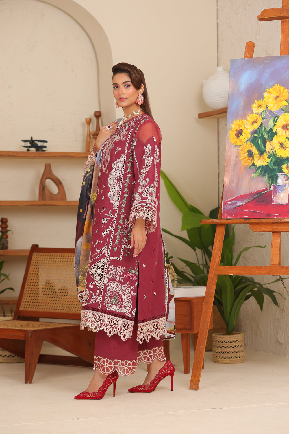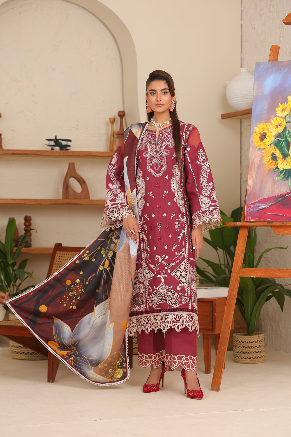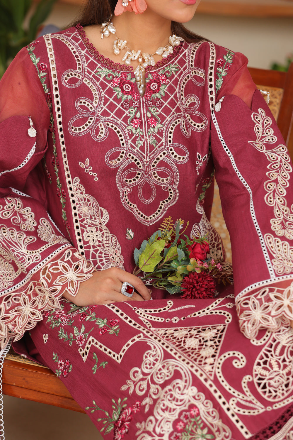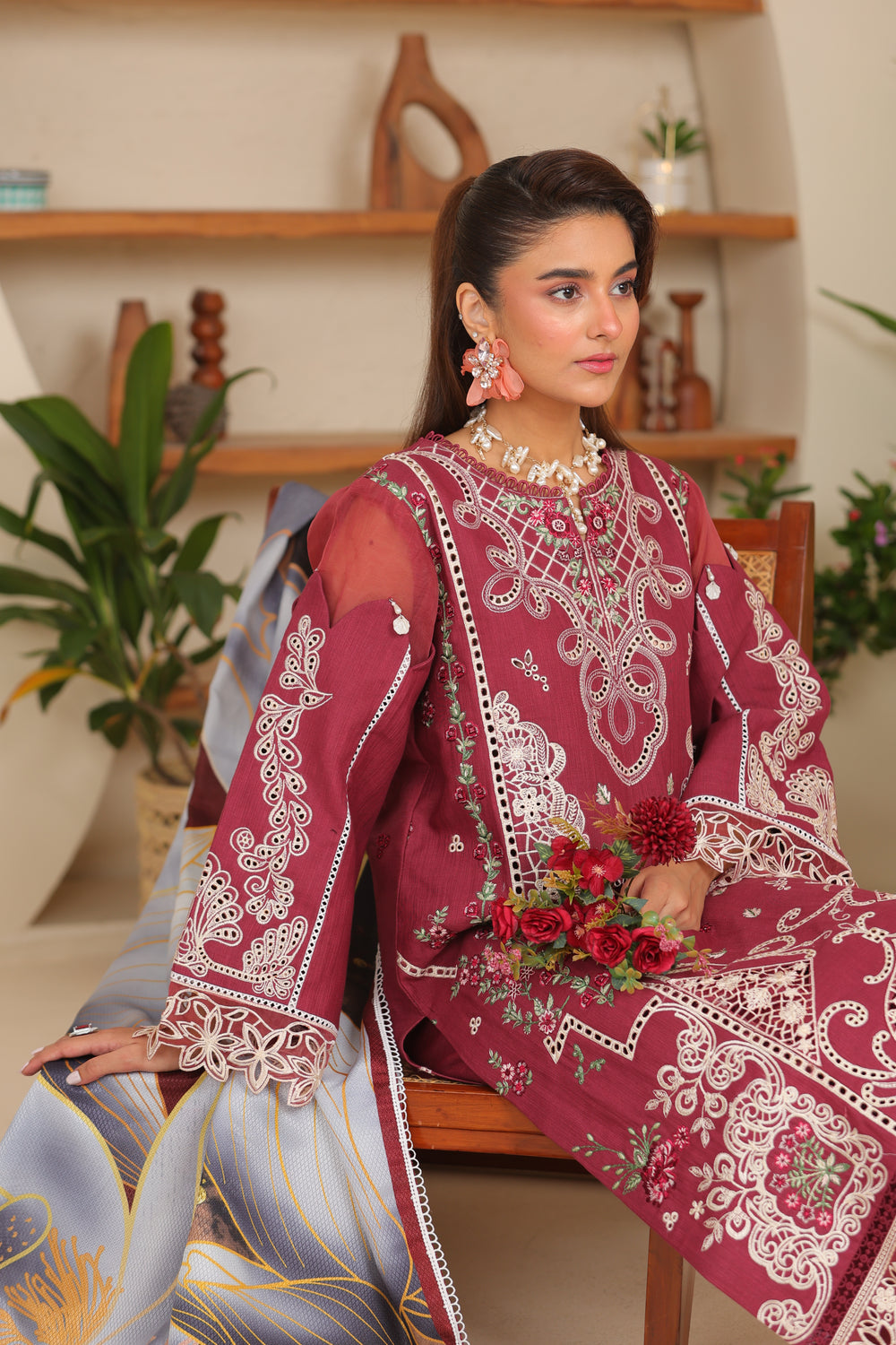 A bold Maroon hue meets timeless luxury in Rubra khaddar suit — featuring intricate embroidery, a dobby net shawl,