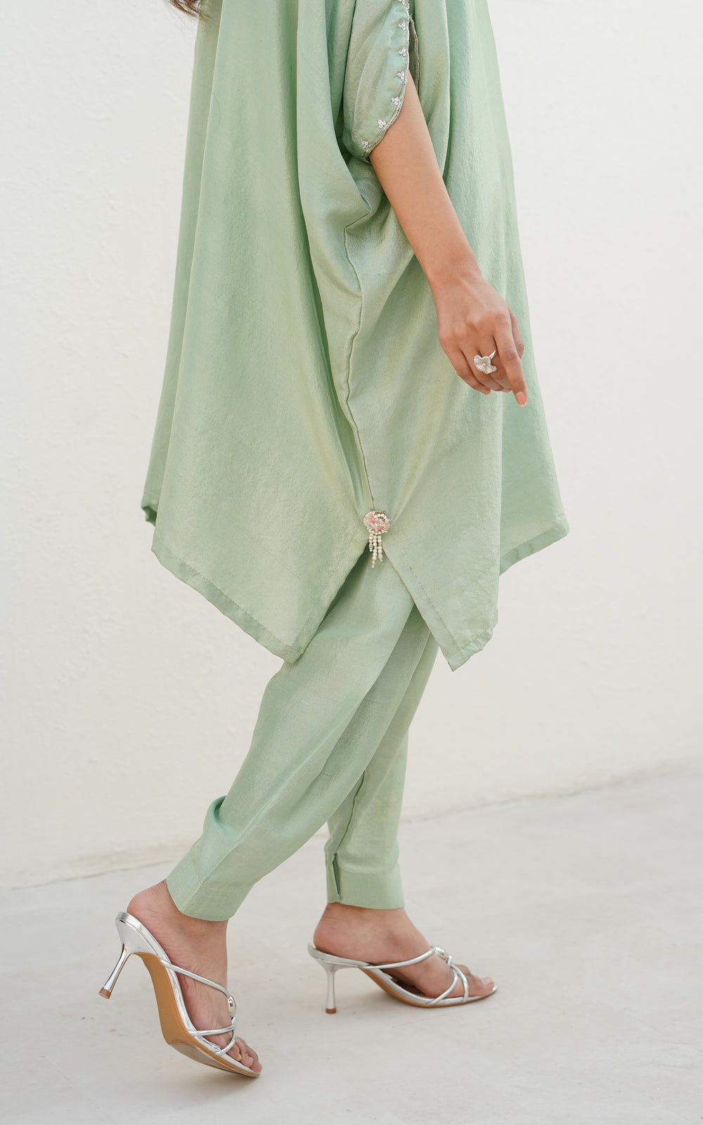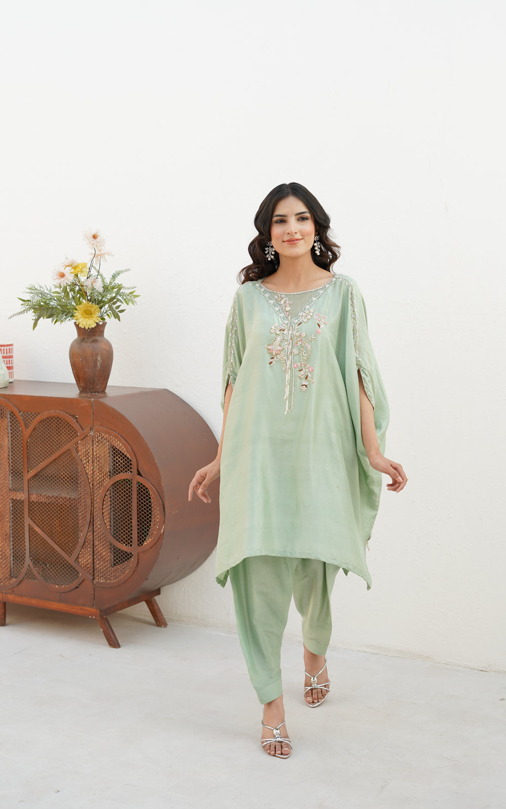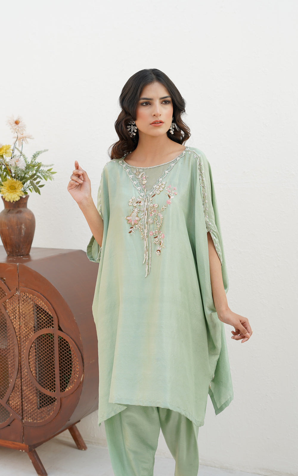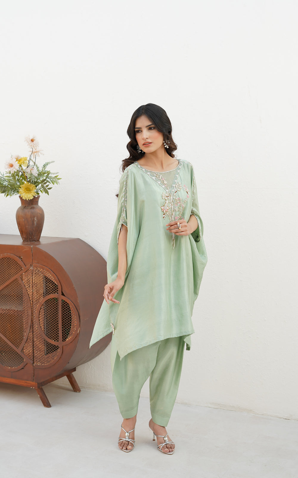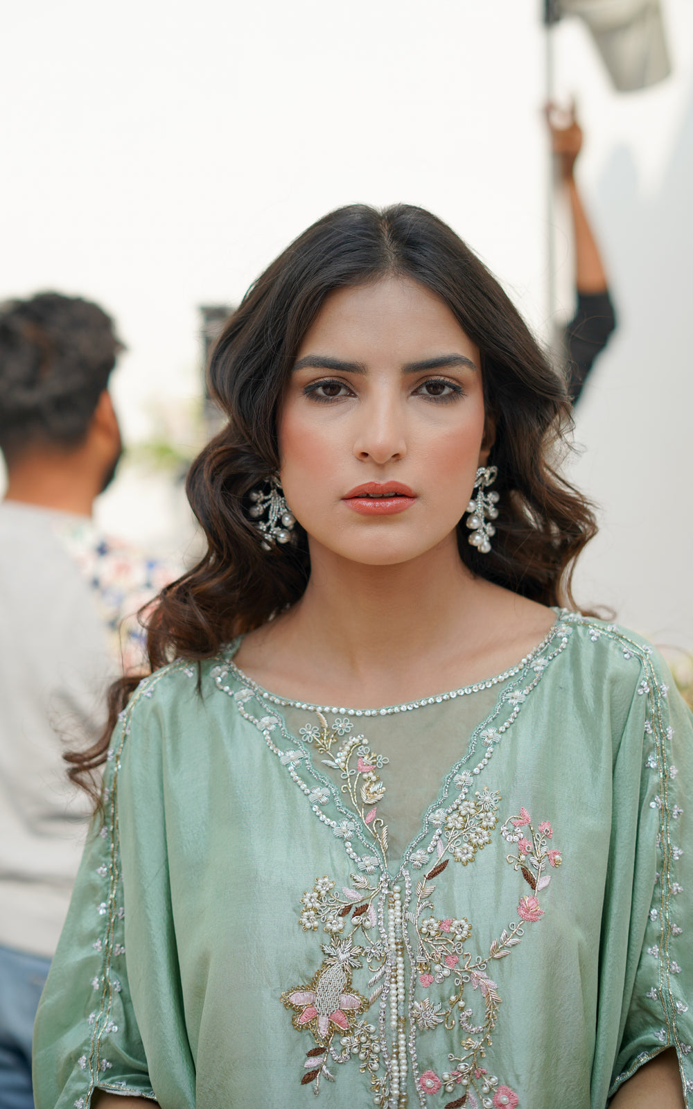 Crafted from premium pure rawsilk, this sage green ensemble features a contemporary baggy shirt paired with a matching shalwar for a graceful yet modern silhouette. The outfit is fully handworked, showcasing exquisite craftsmanship and attention to detail.