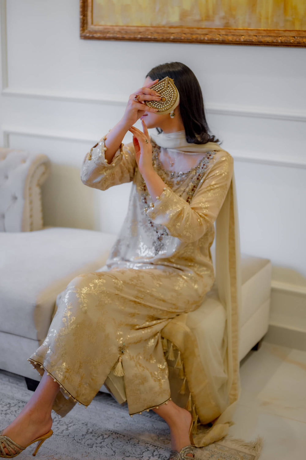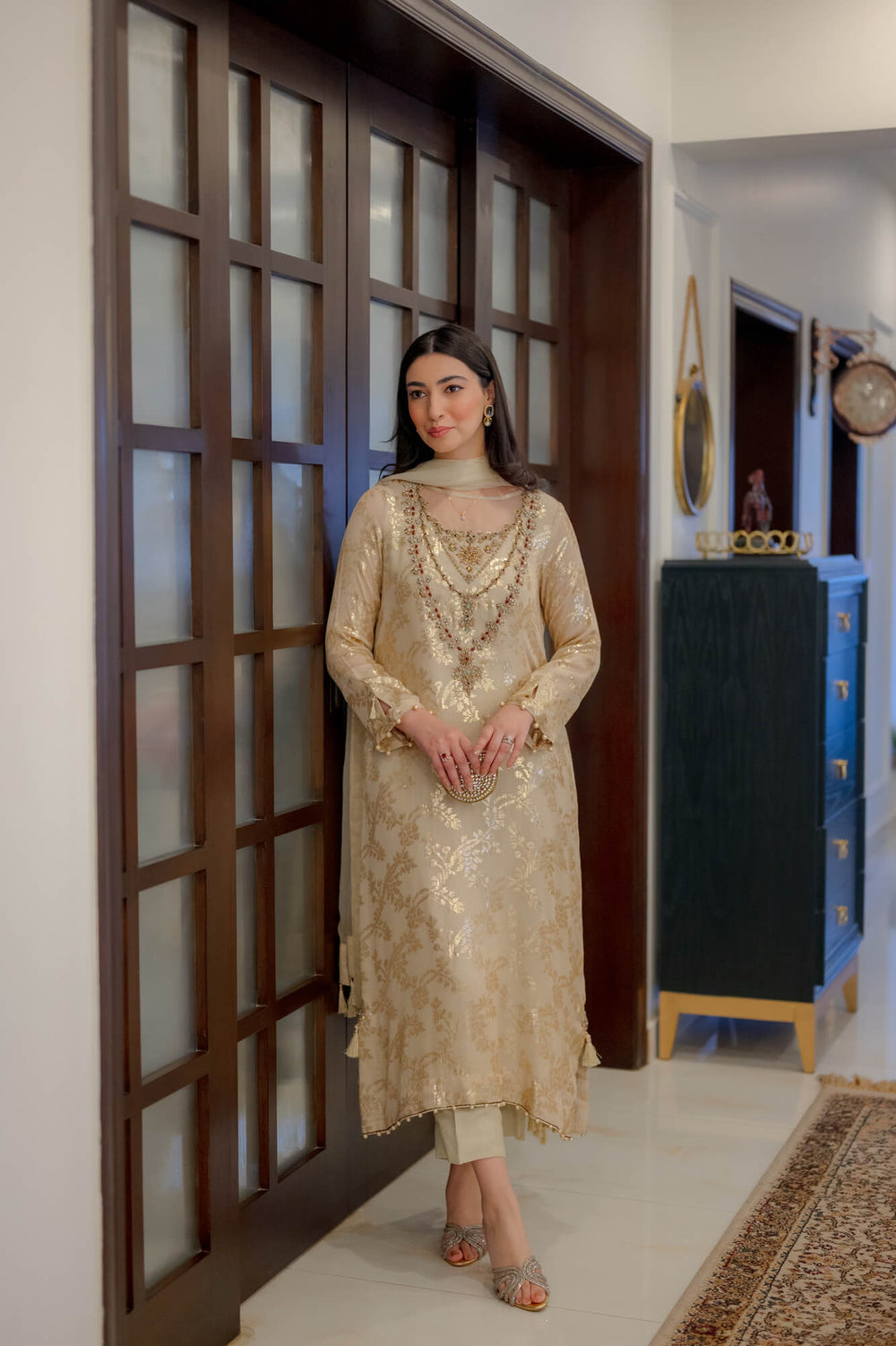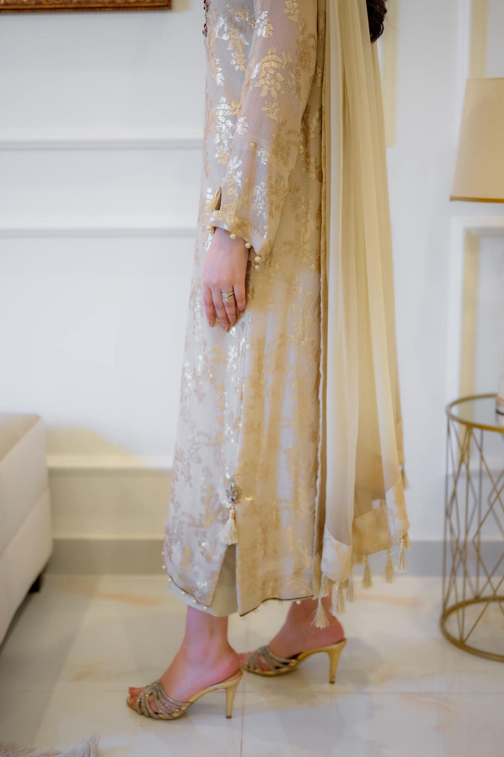 A vision of timeless grace, this ethereal ensemble is crafted from a rich, gold-hued fabric adorned with intricate zari work, exuding effortless luxury. The flared sleeves are elegantly detailed with pearl embellishments at the ends, with a delicately placed tassel nestled inside for an extra touch of finesse. The sheer dupatta, adorned with dainty tassels all around, enhances the outfit’s regal charm. Paired with tailored trousers, this ensemble is perfect for festive occasions, radiating understated opulence and sophistication.