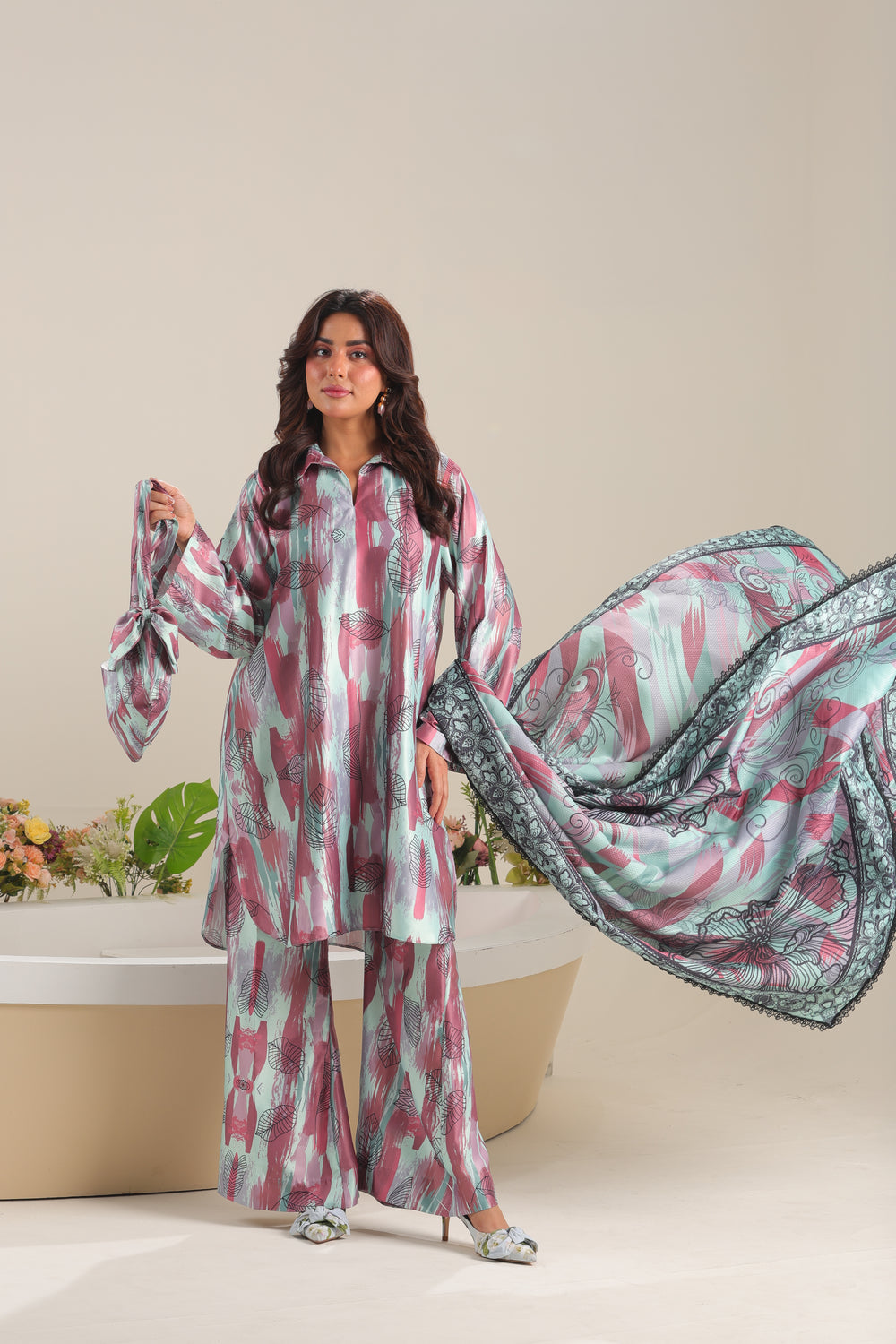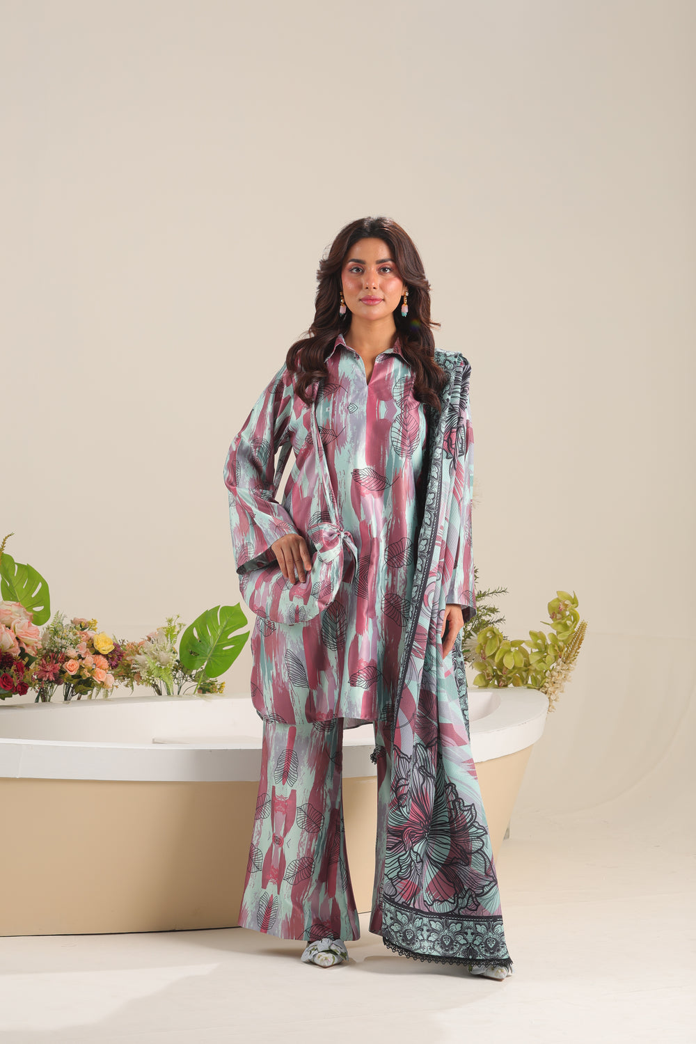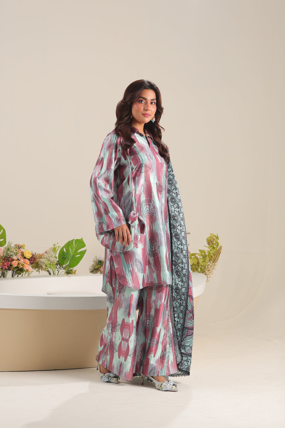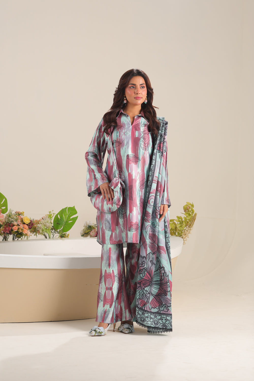 Unstitched The Silvara 3-piece satin silk set includes a stylish printed shirt, a graceful shamooz silk dupatta, and coordinating