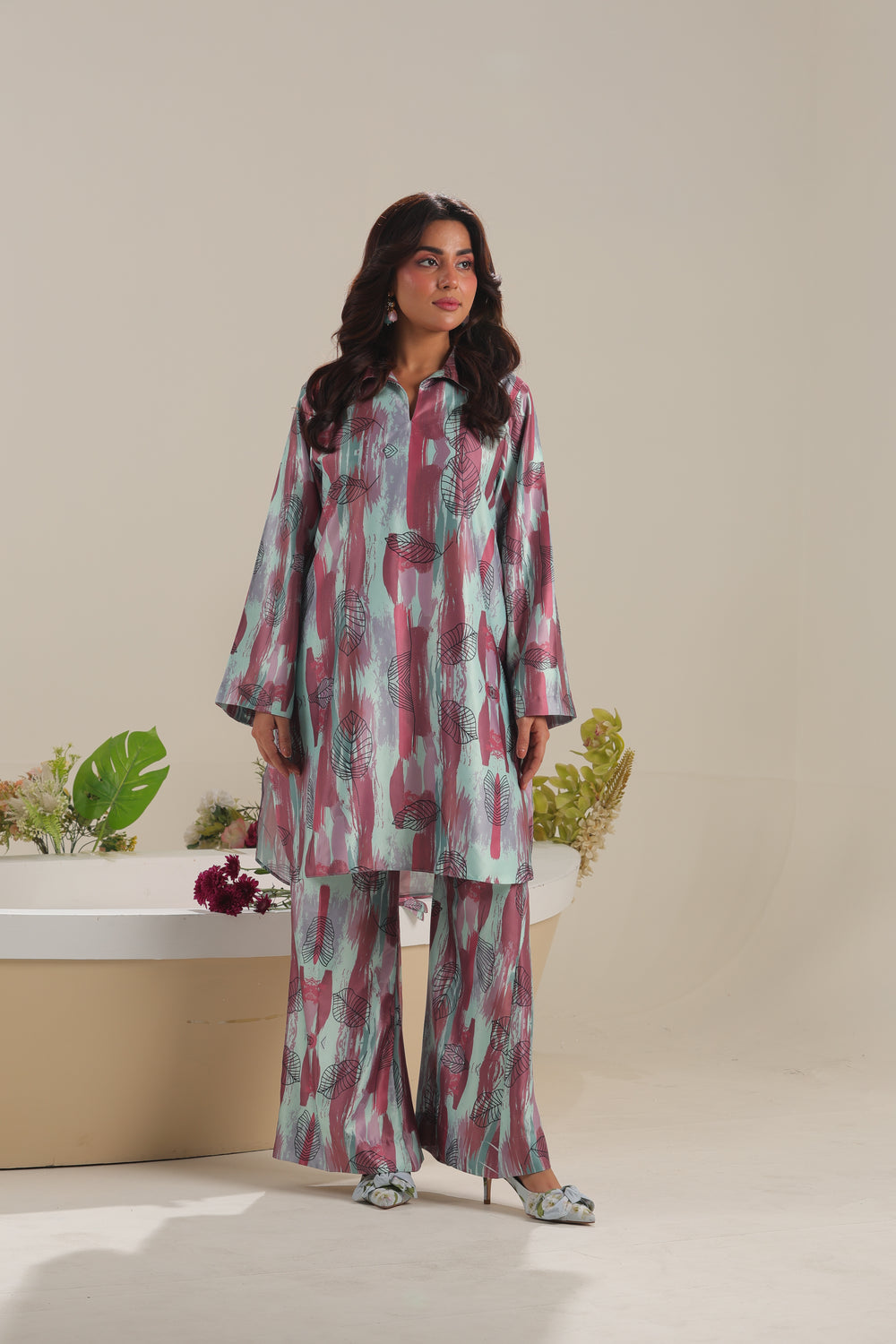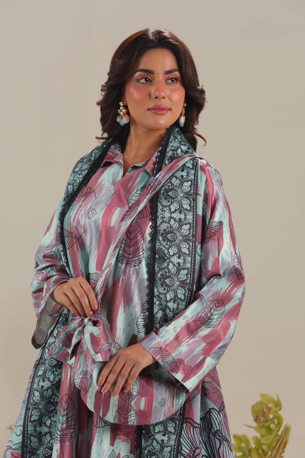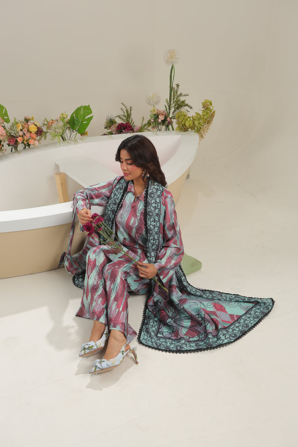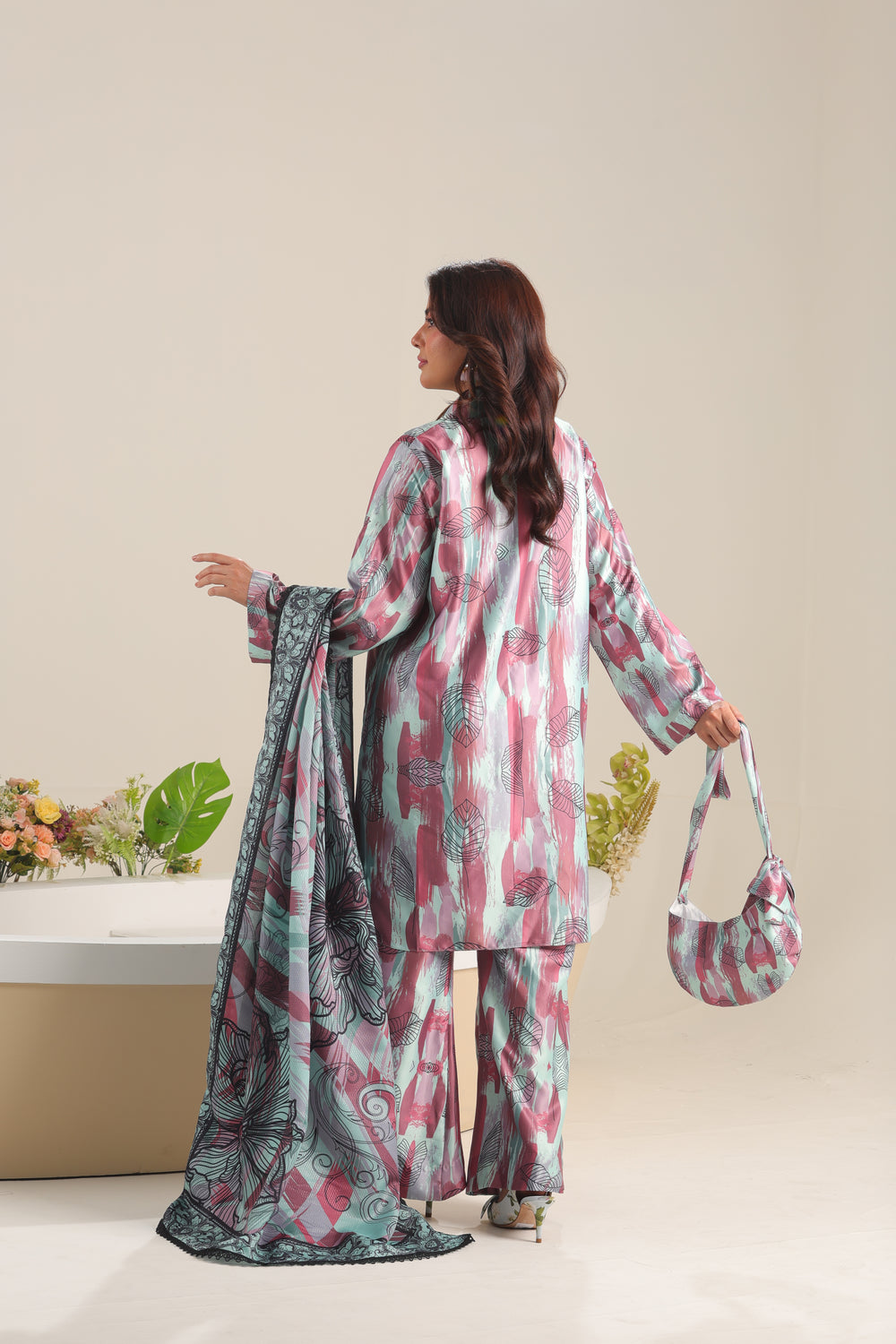 Unstitched The Silvara 3-piece satin silk set includes a stylish printed shirt, a graceful shamooz silk dupatta, and coordinating