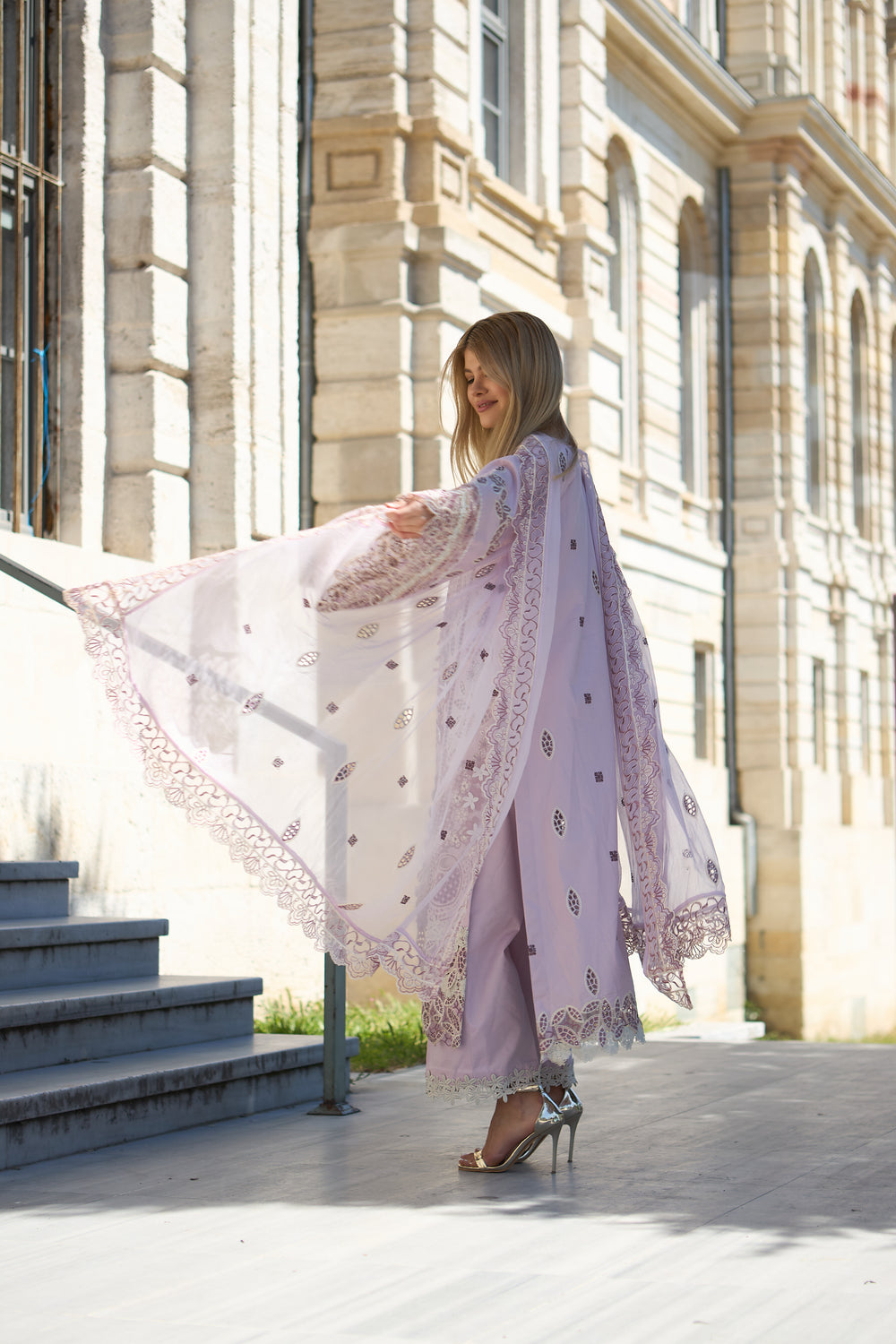Classic symphonia 3-piece lawn embroidered suit with chiffon dupatta and cotton lawn trousers, available in unstitched