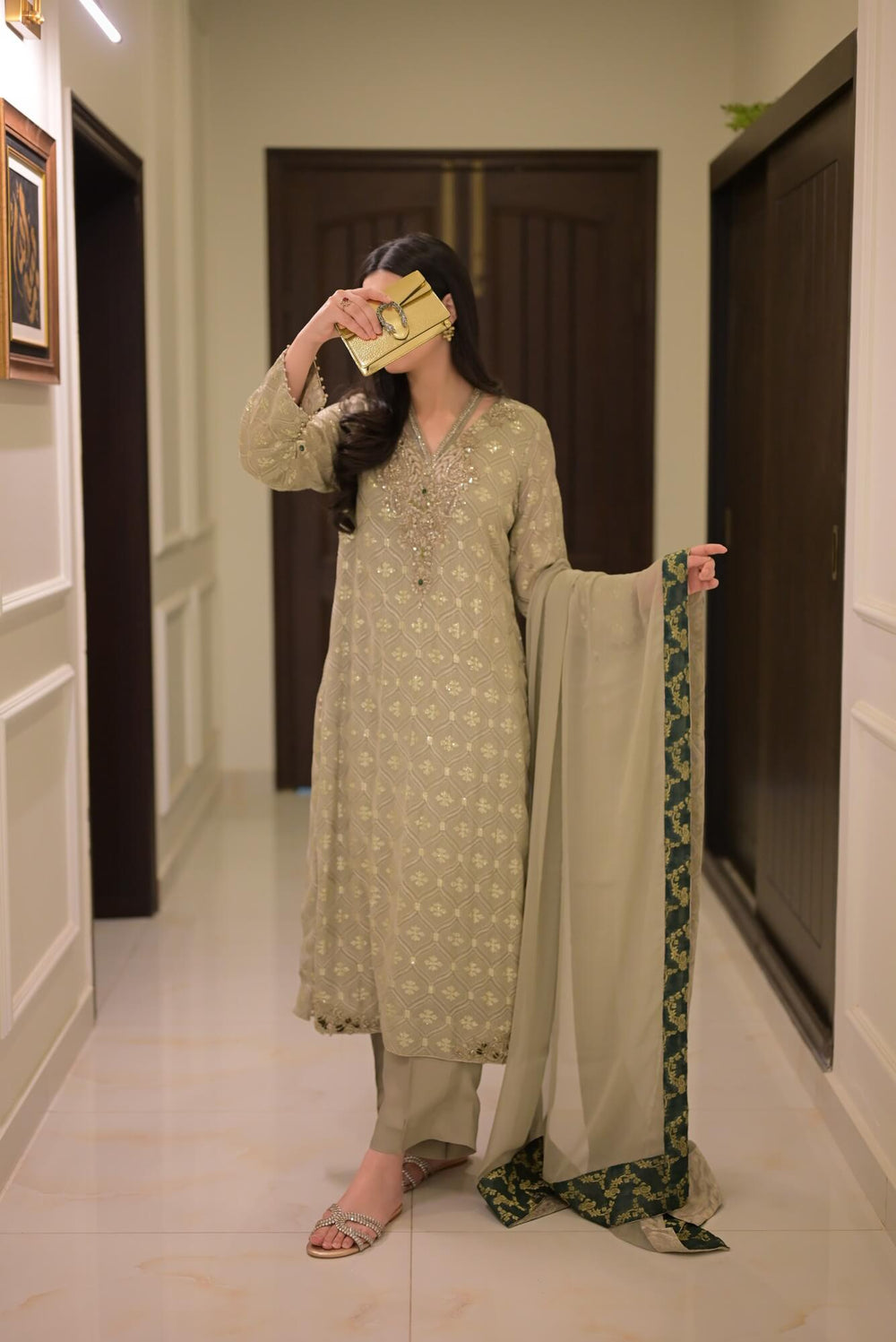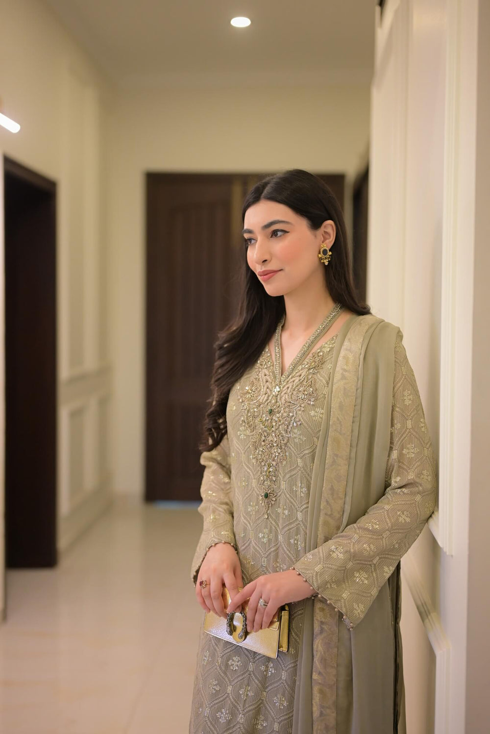 Draped in an ethereal muted grey, Tajwar embodies quiet sophistication and majestic charm. The ensemble features a rich jacquard base intricately woven with a geometric floral pattern, glistening subtly with metallic threadwork that catches the light at every angle. At its heart lies a masterfully hand-embellished neckline, cascading with zari, dabka, pearls, and crystal stones, accentuated by a single deep green stone at the center bringing an aura of regality to the piece. The neckline is bordered with a double-layered detailed trim that adds dimension and grace. The sleeves flow into a delicate flare, each cuff adorned with dainty pearl bead tassels that enhance the femininity of the silhouette. Completing the look is a textured dupatta, its borders elegantly woven with motifs in harmony with the shirt, offering an effortlessly graceful drape.