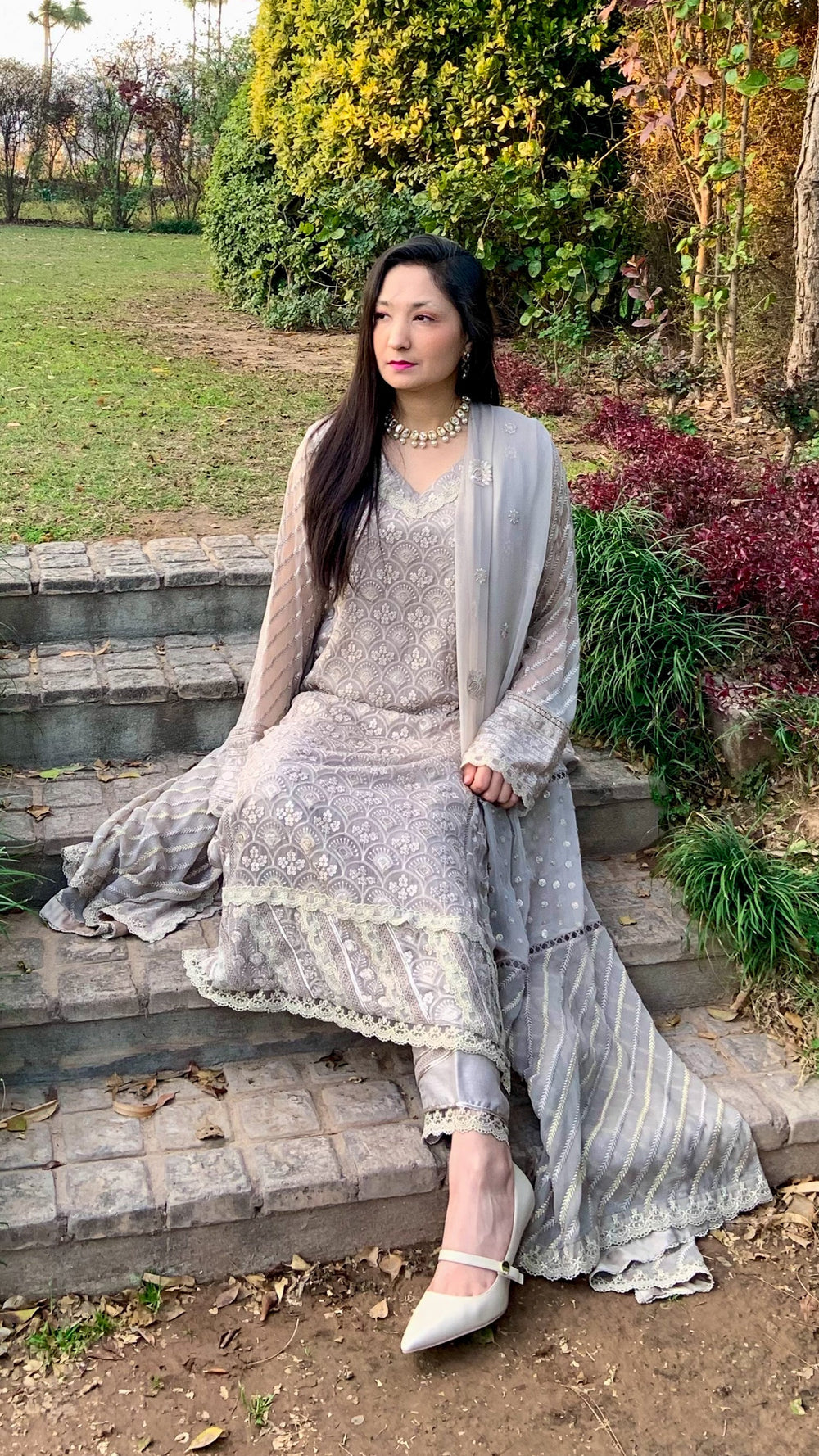 Materials Pure chiffon chikankari shirt, pure chiffon dupatta, indian raw silk trousers & imported laces. All our work is done by locally employed craftsmen and workers.