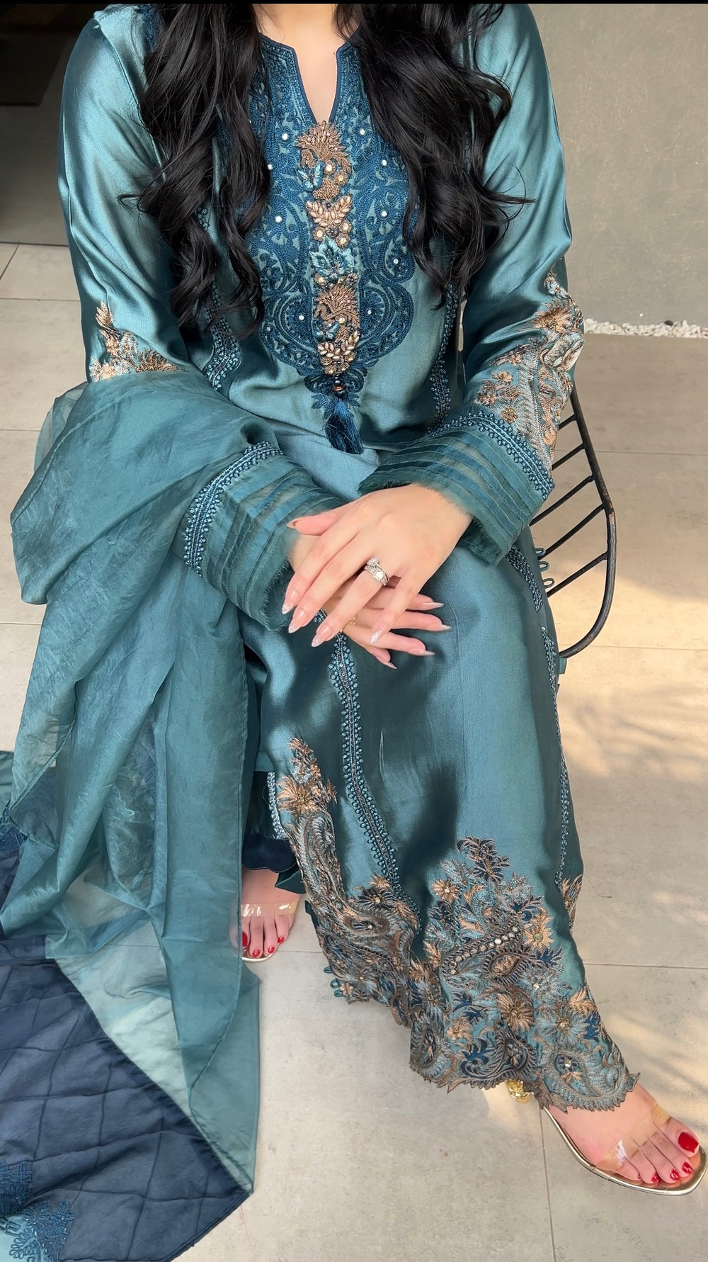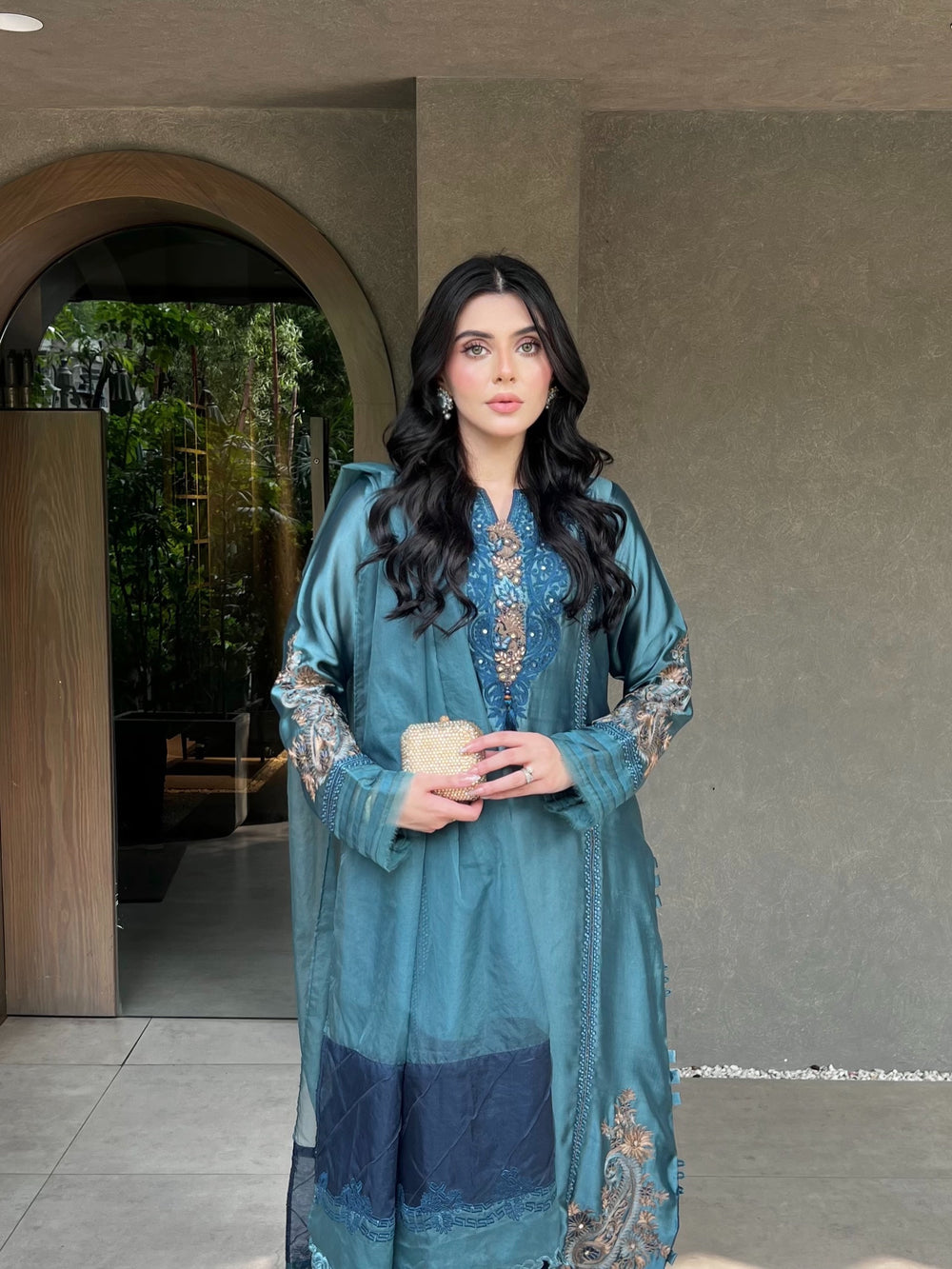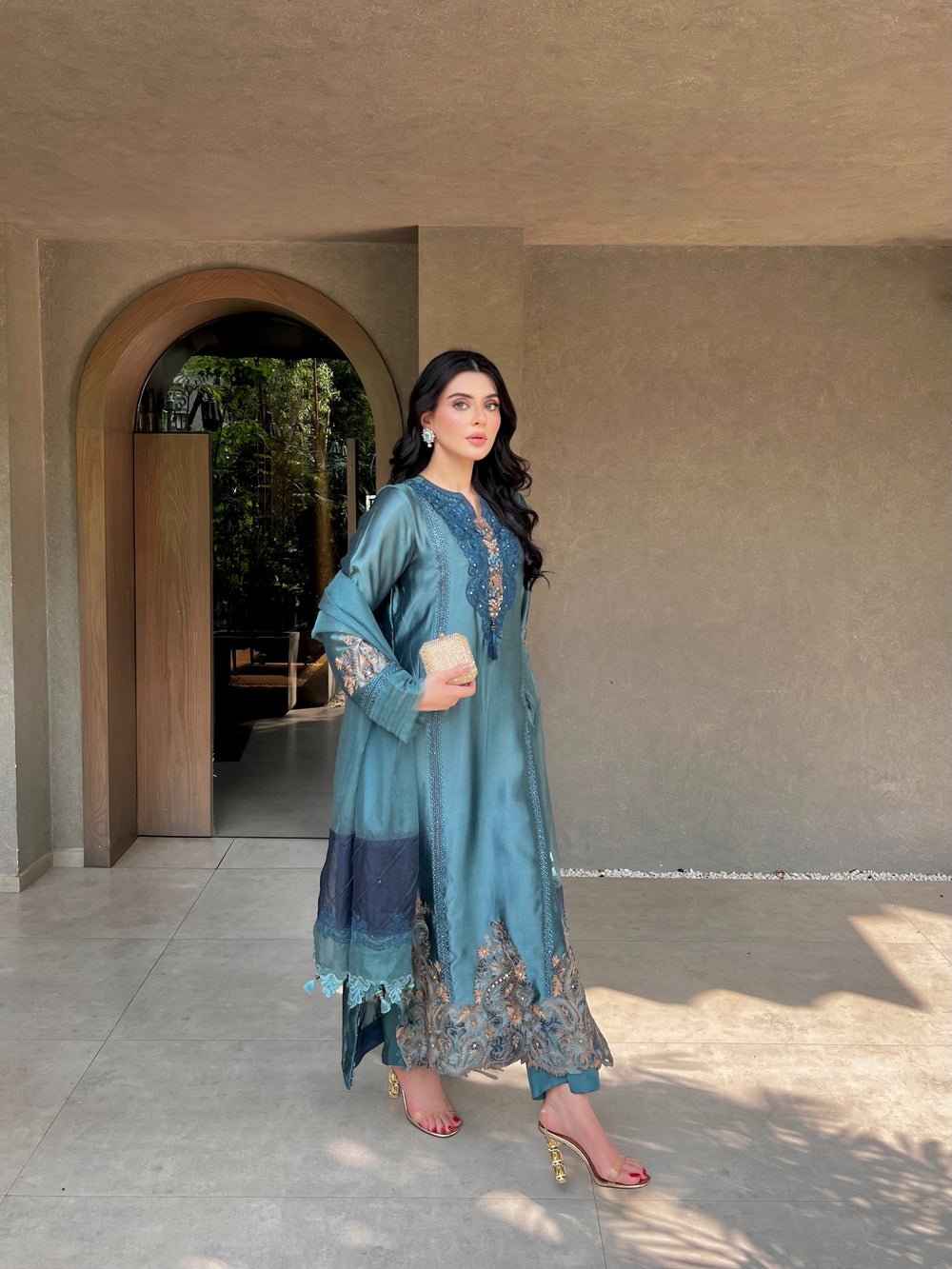 Pure sheesha tissue shirt, Korean silk trousers, silk-organza dupatta