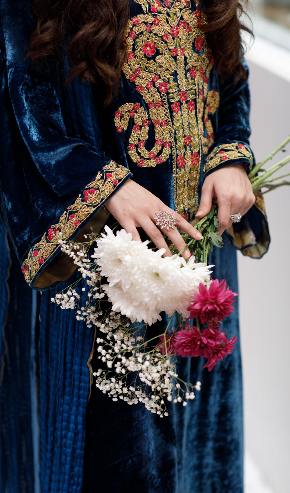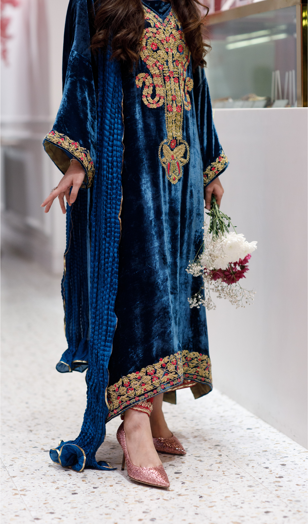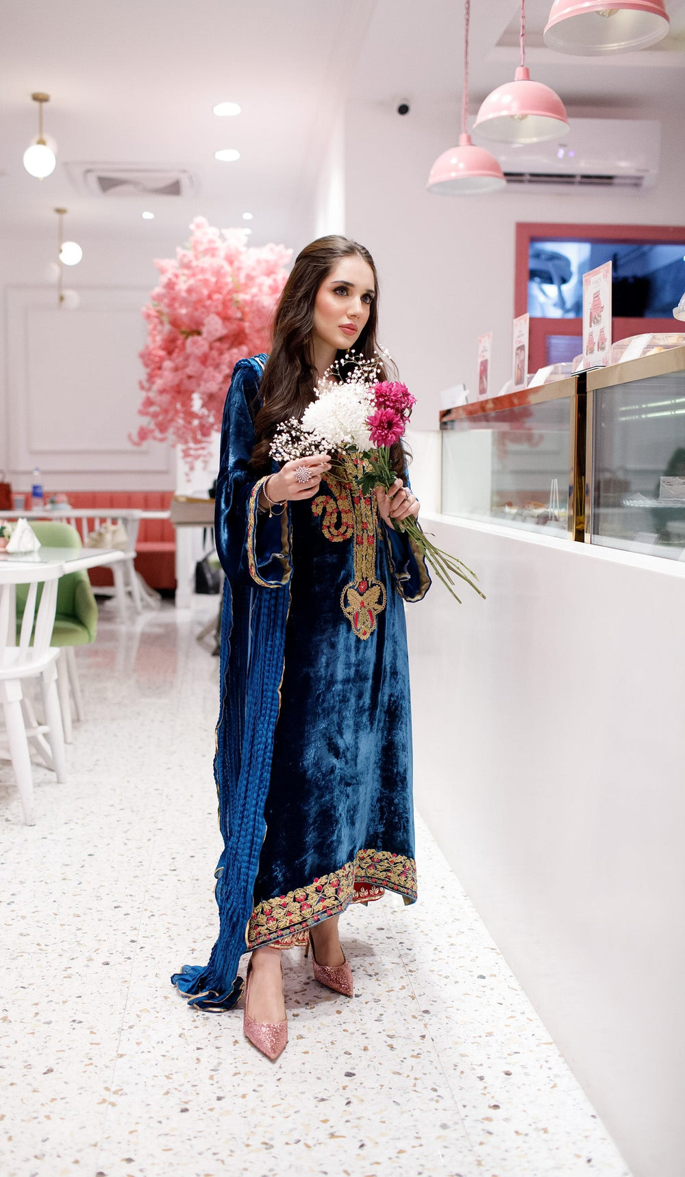 Teal green velvet is a perfect color for this winter season. The shirt has delicate embroidery on the neckline, sleeves and daman. paired with Korean silk pants and medium silk dupatta finished with organza frills.