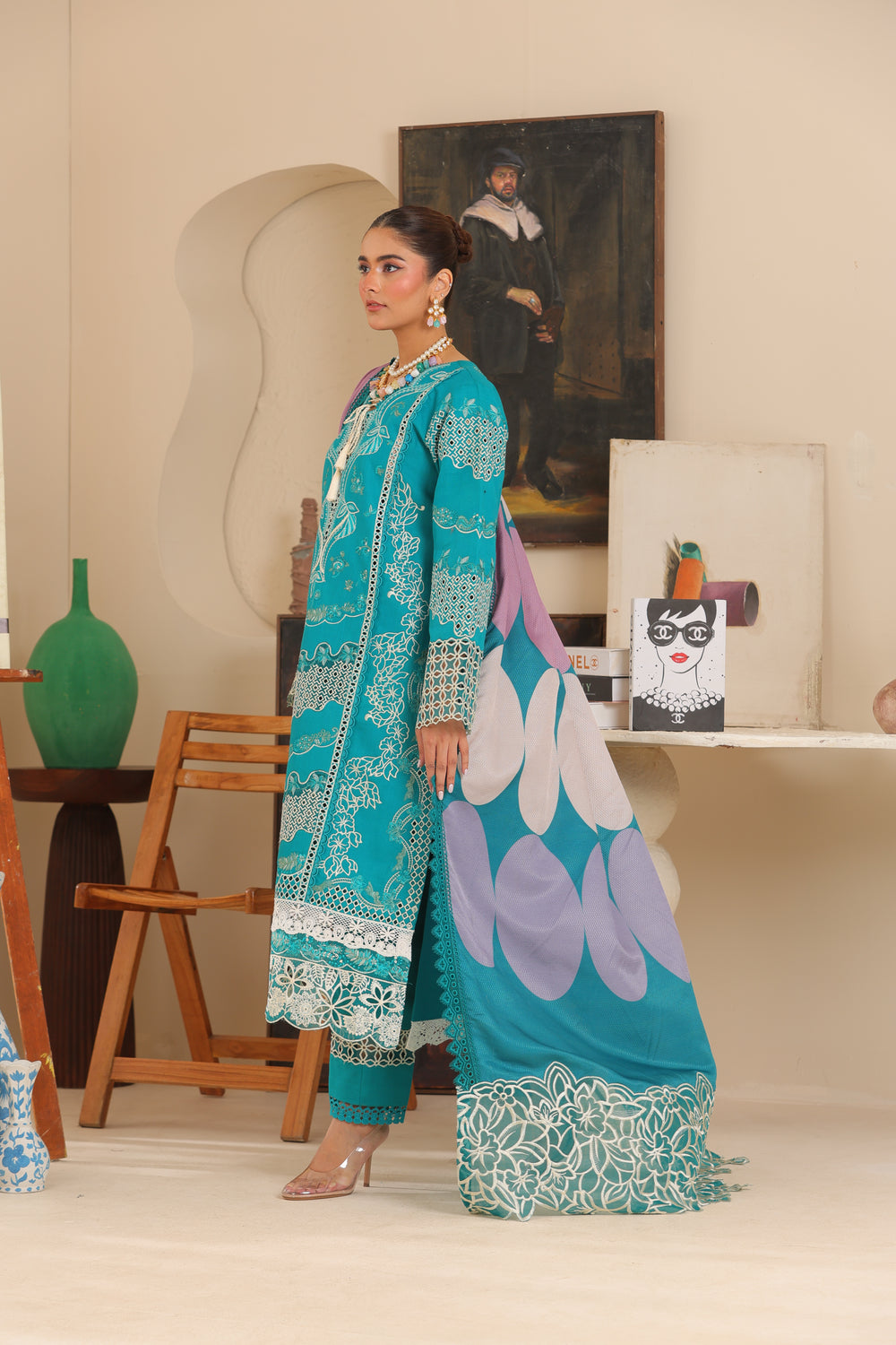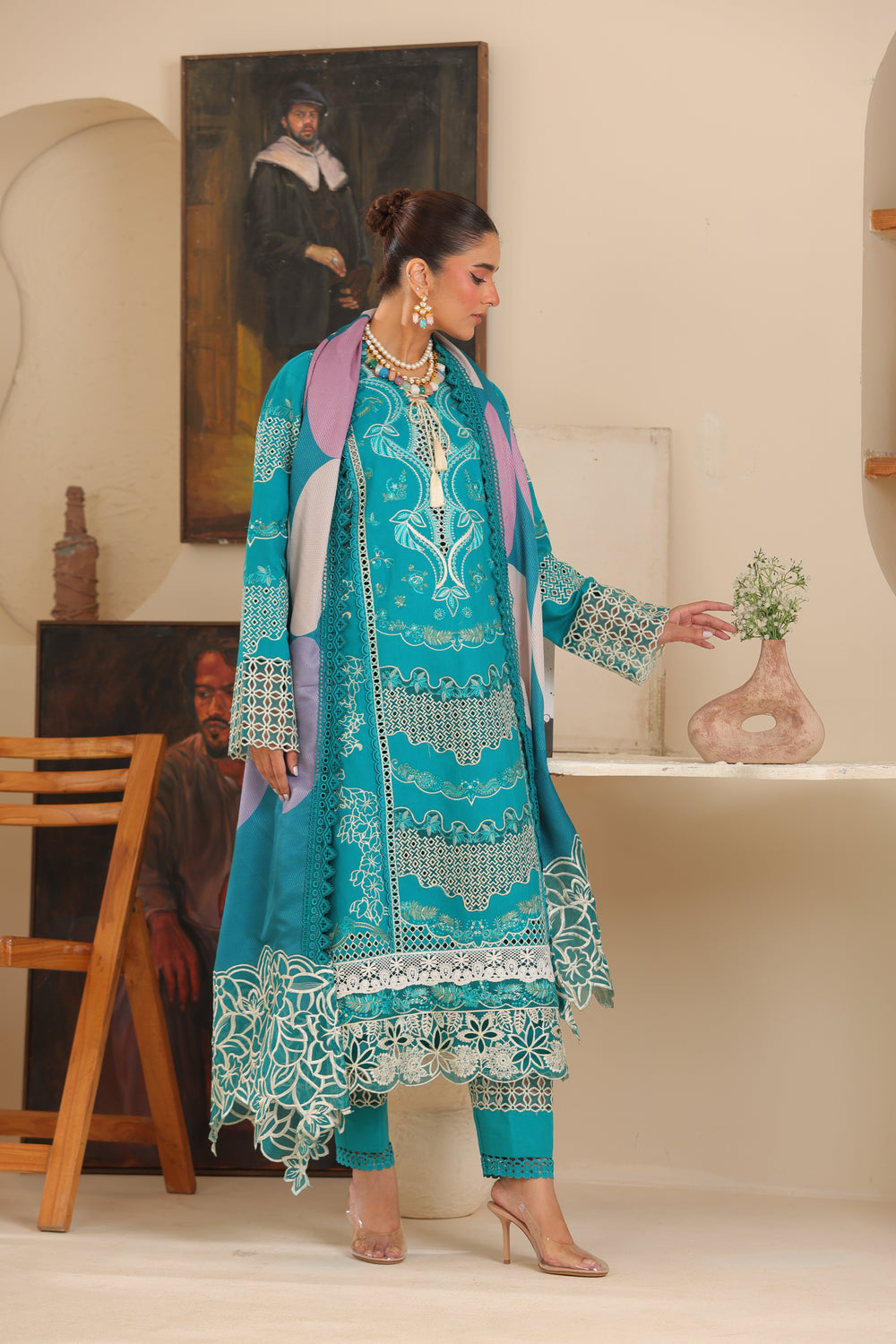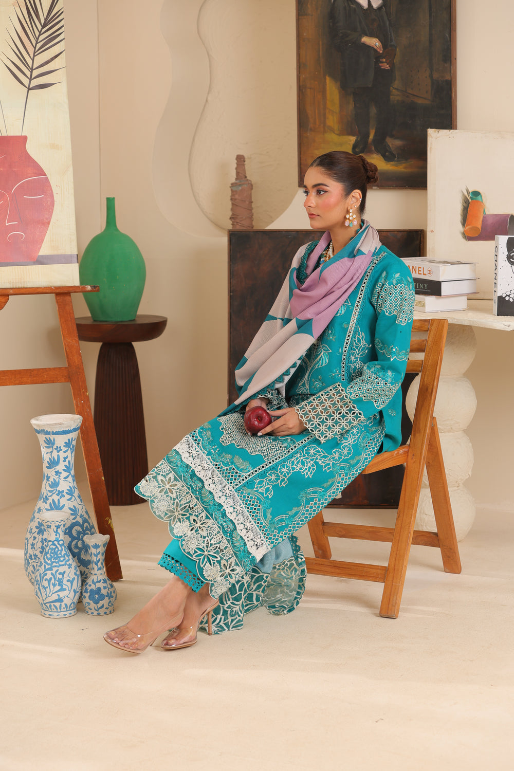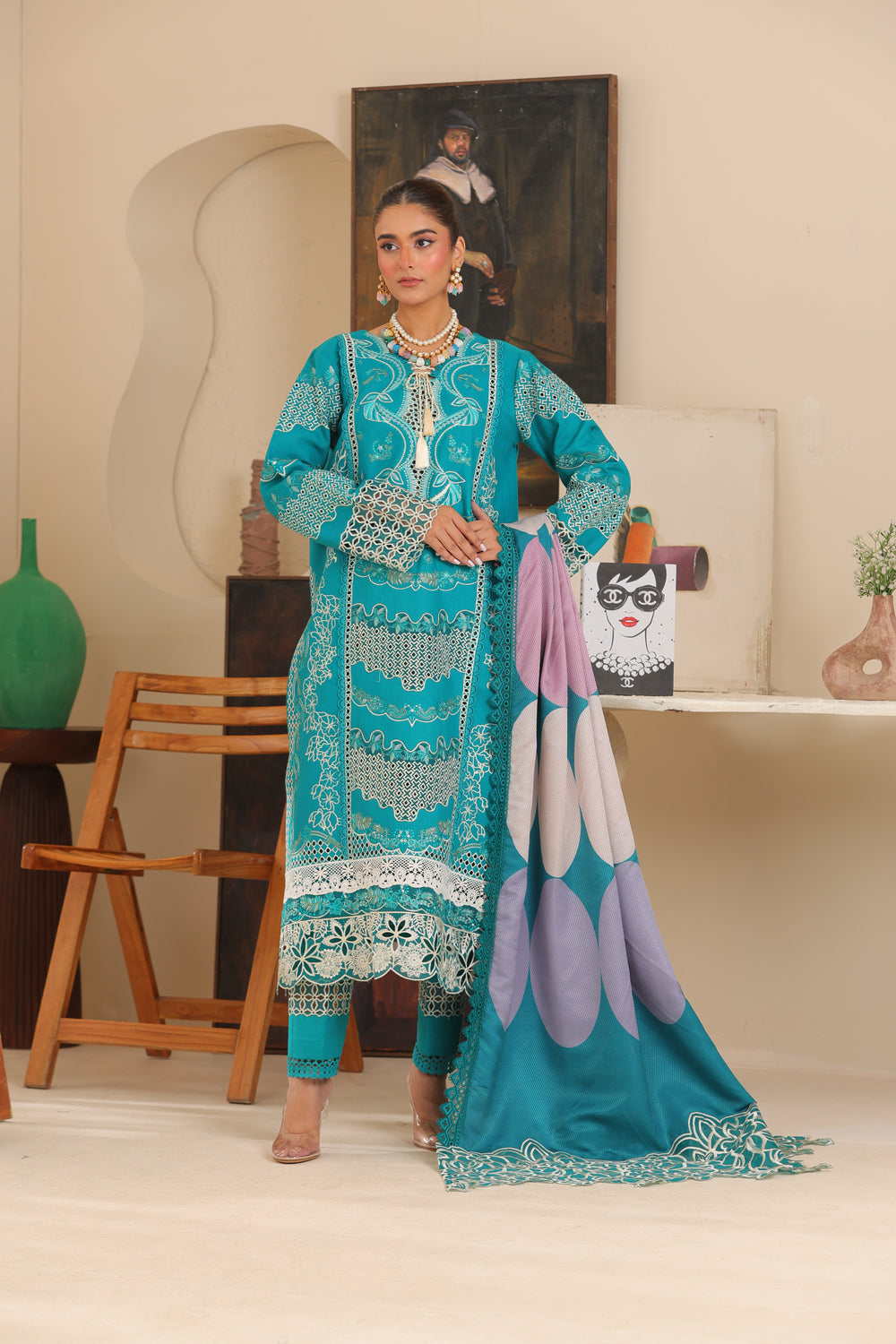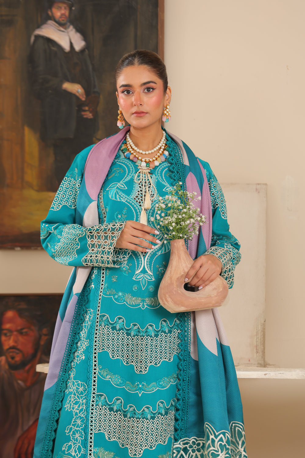 The Turqis 3-piece embroidered khaddar outfit features a stylish printed khaddar shirt, a soft dobby net dupatta, and