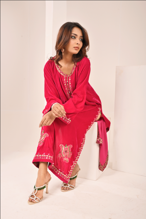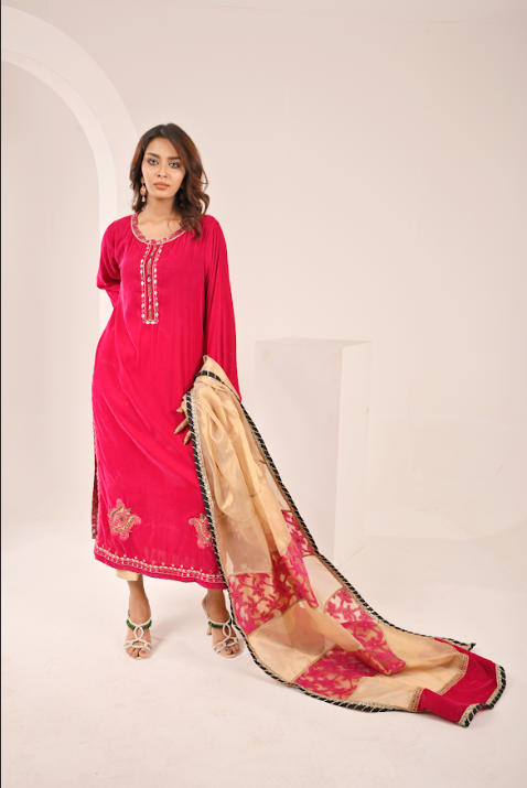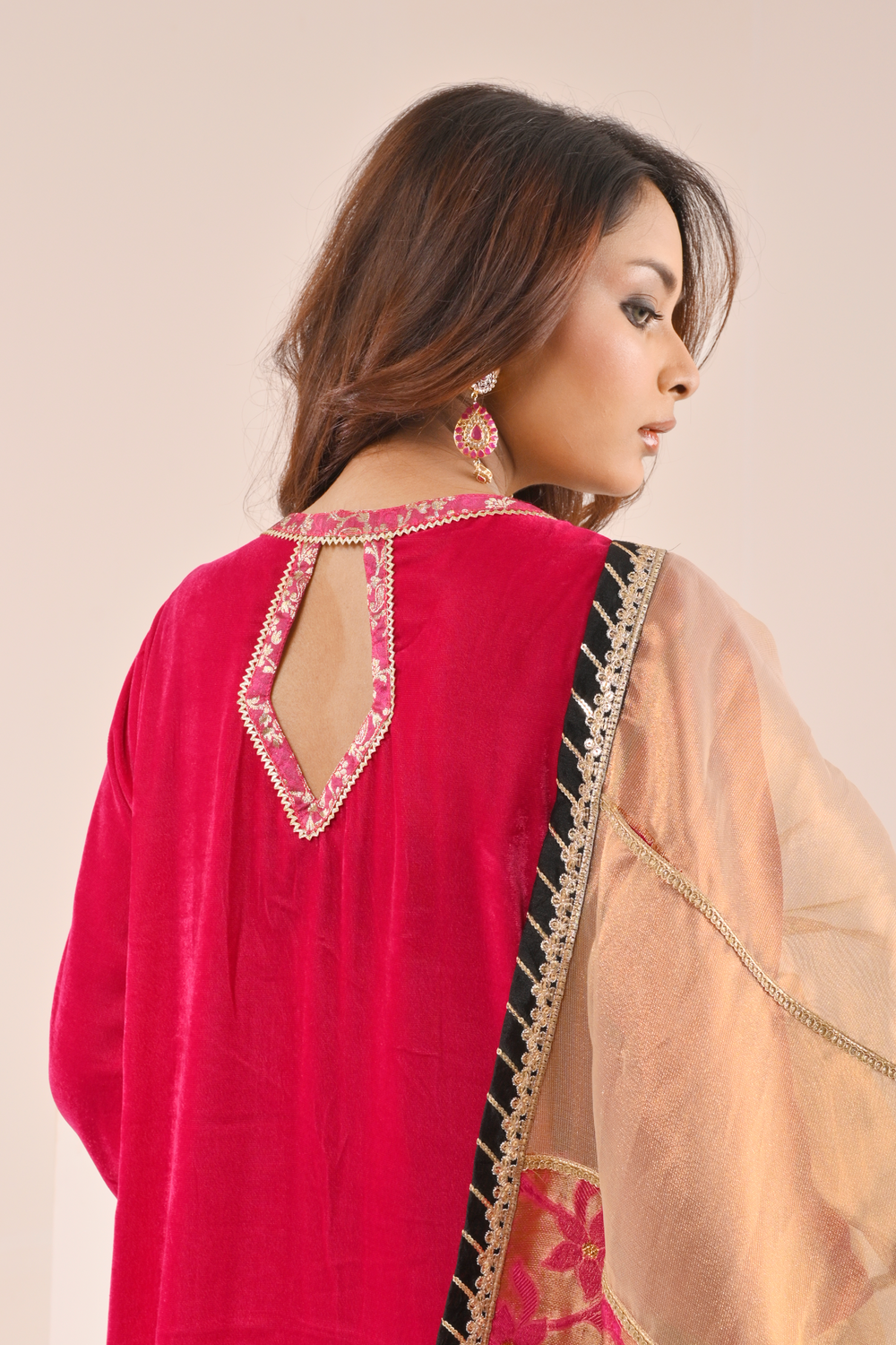 This exquisite outfit features a long velvet shirt, radiating elegance and luxury. Paired with a stunning golden and black lama dupatta, the ensemble is perfect for timeless occasions. The shirt is beautifully decorated with intricate mirror embroidery and gota work on the neckline, sleeves, and chalk daman. Dabka, sequins, stones, and delicately crafted motifs further enhance the regal allure of the design.