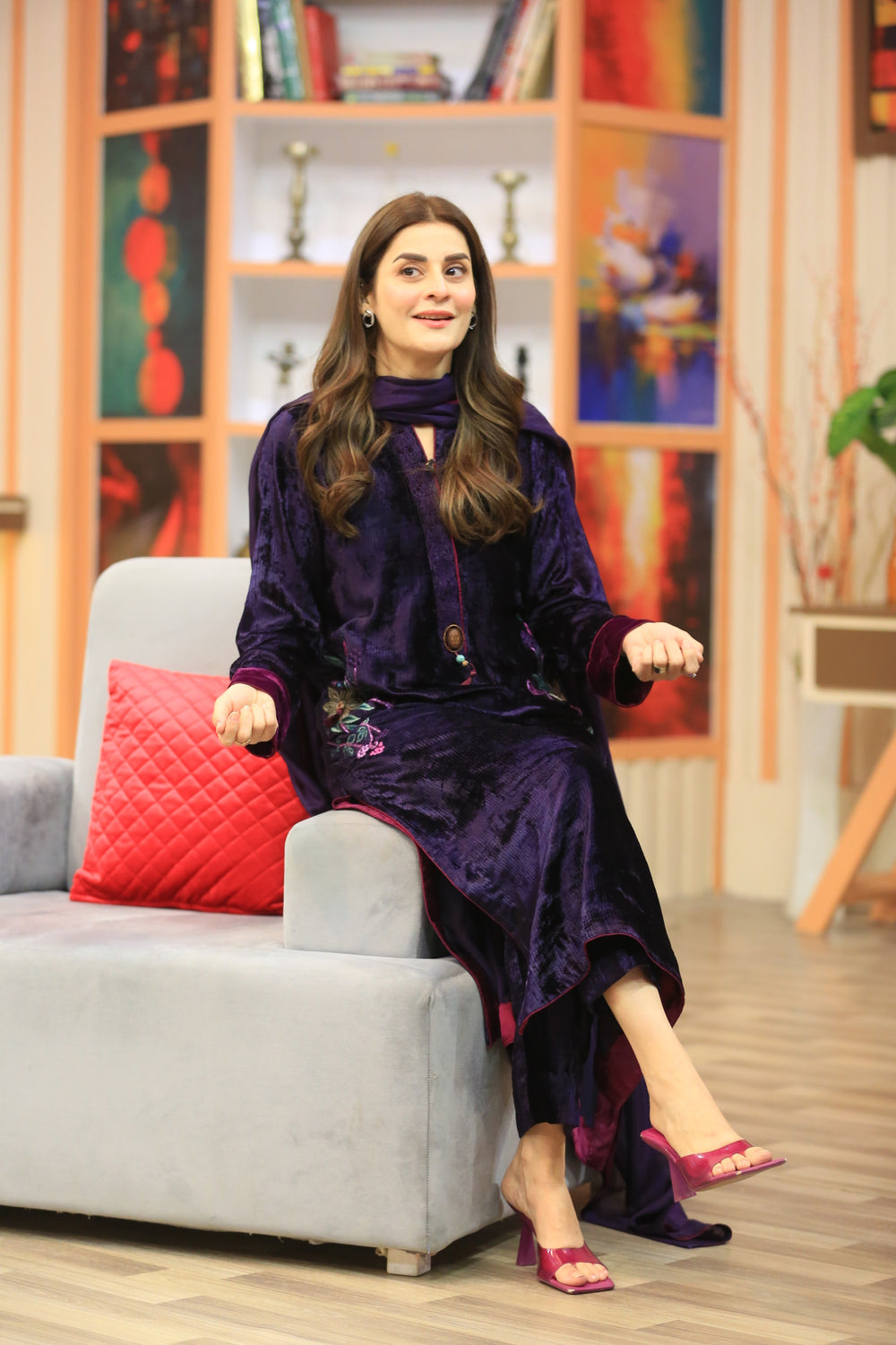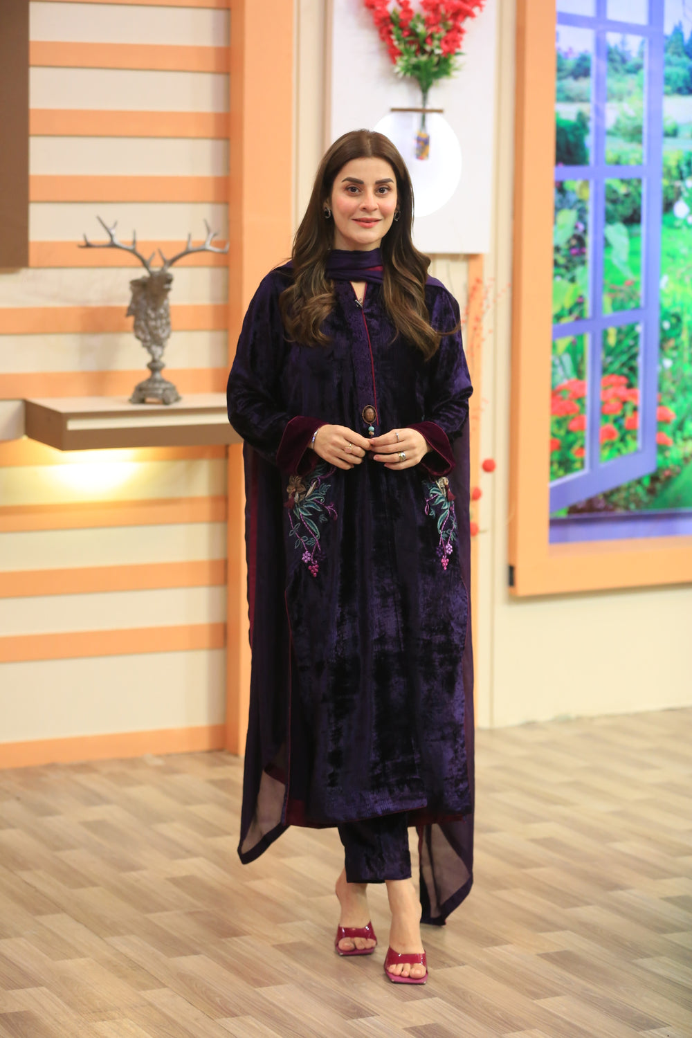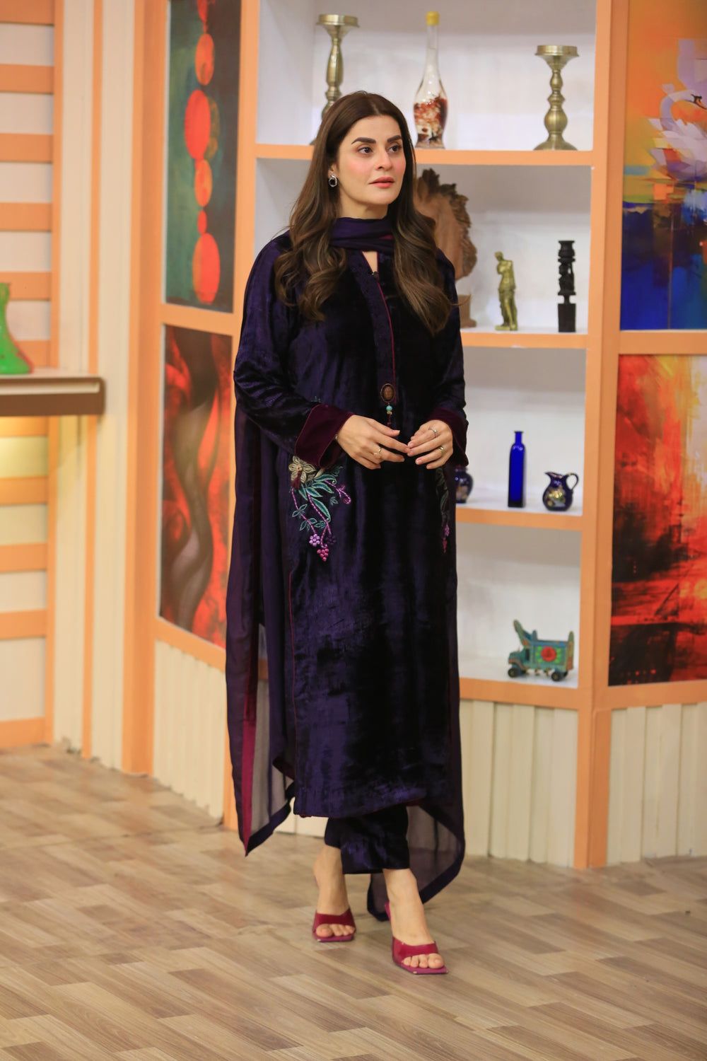 A vision of elegance in deep coudroy velvet, this ensemble exudes sophistication with its rich texture and timeless appeal. The slouch pocket style , adorned with intricate floral embroidery in hues of teal, lilac, and berry, add a touch of effortless charm while ensuring functionality. The long, flowing silhouette is elevated by plush velvet cuffs and a tasseled front accent, making it a perfect blend of tradition and modern luxury. Paired with matching trousers and a sheer dupatta, this outfit is a must-have for evening soirées and festive gatherings.