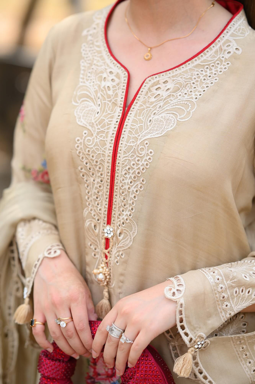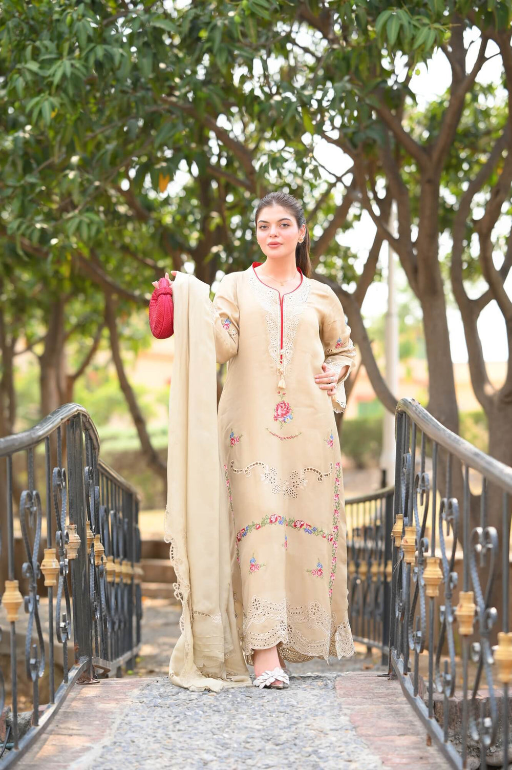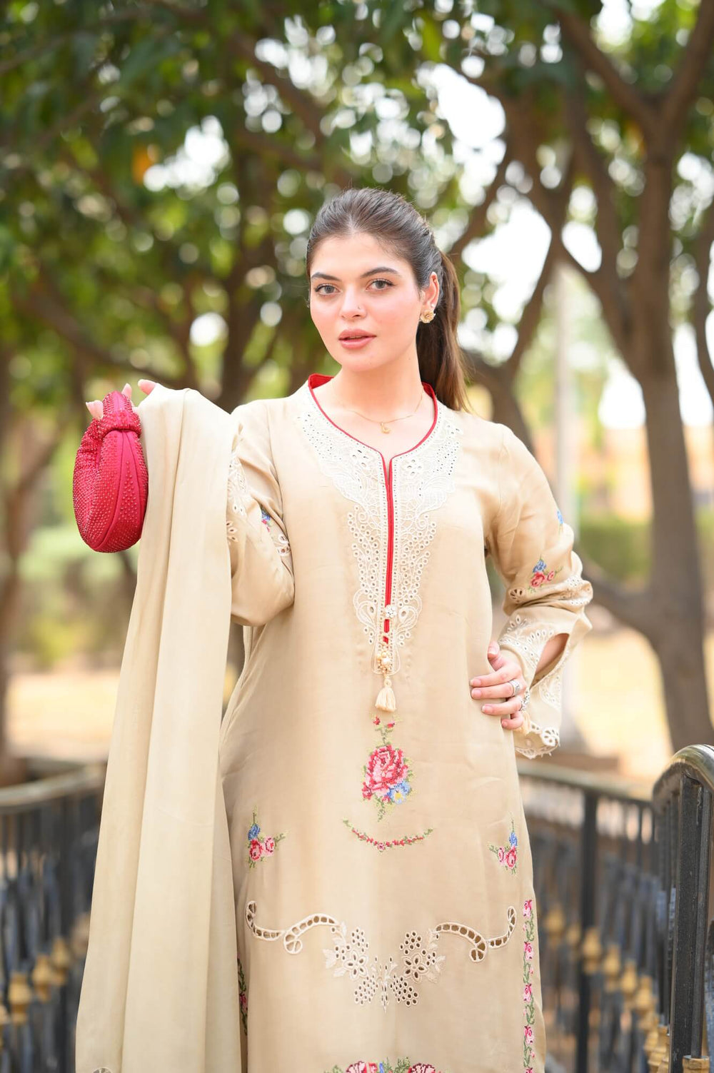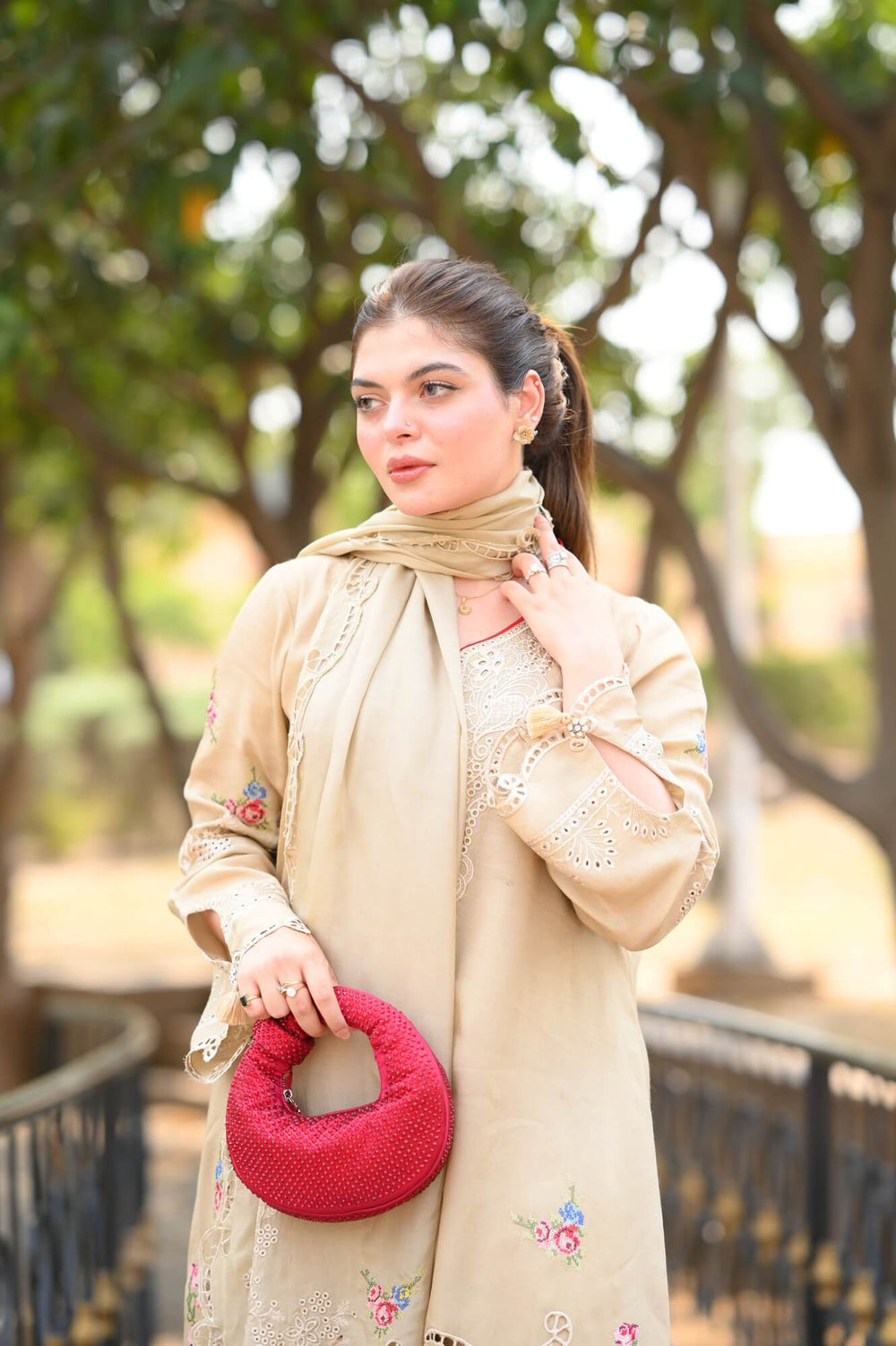 Delicately stitched in timeless elegance, Whispers of Thread is a graceful ensemble that celebrates the charm of intricate handcraft. The outfit features a soft, earthy beige base adorned with delicate crotch stitch embroidery, brought to life with blooms in hues of pink, red, and blue. The hemline and dupatta edges are finished with laser-cut eyelet detailing and floral lace borders, adding depth and finesse to the overall design.