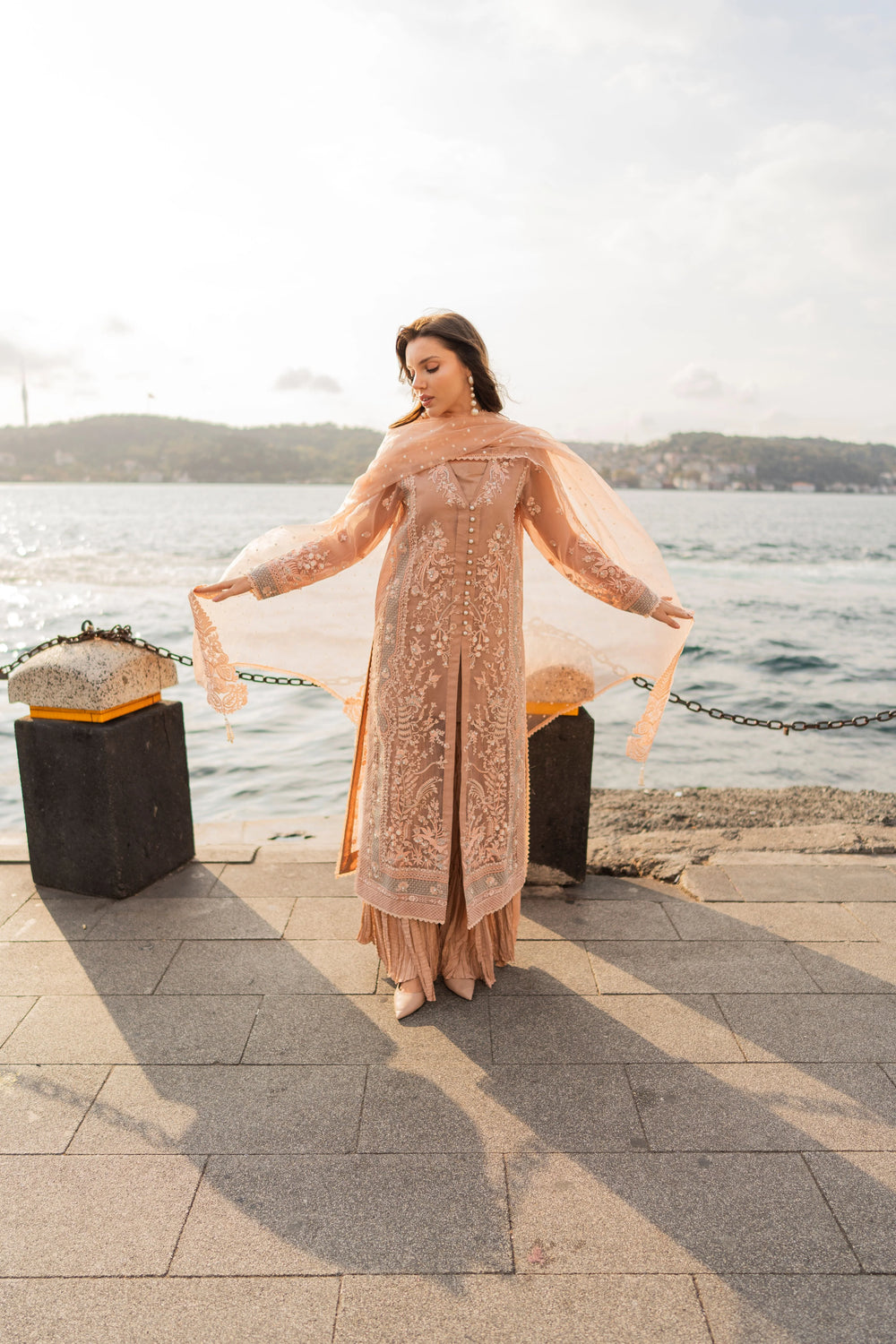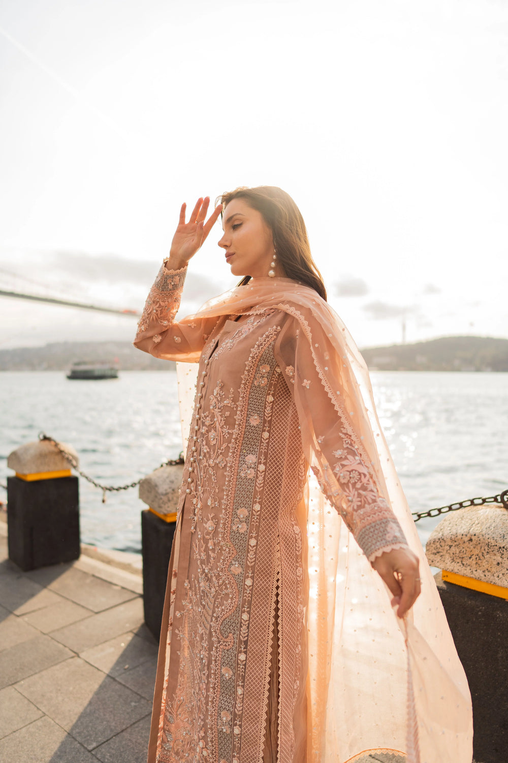 1) Pure organza shirt with hand Embroidered all over work on front, back & Sleeves (dapka,nakshi ,3D,Rasham, Swarovski, pearls, sequins, etc) with daman embroidered border detailing and finished edges.