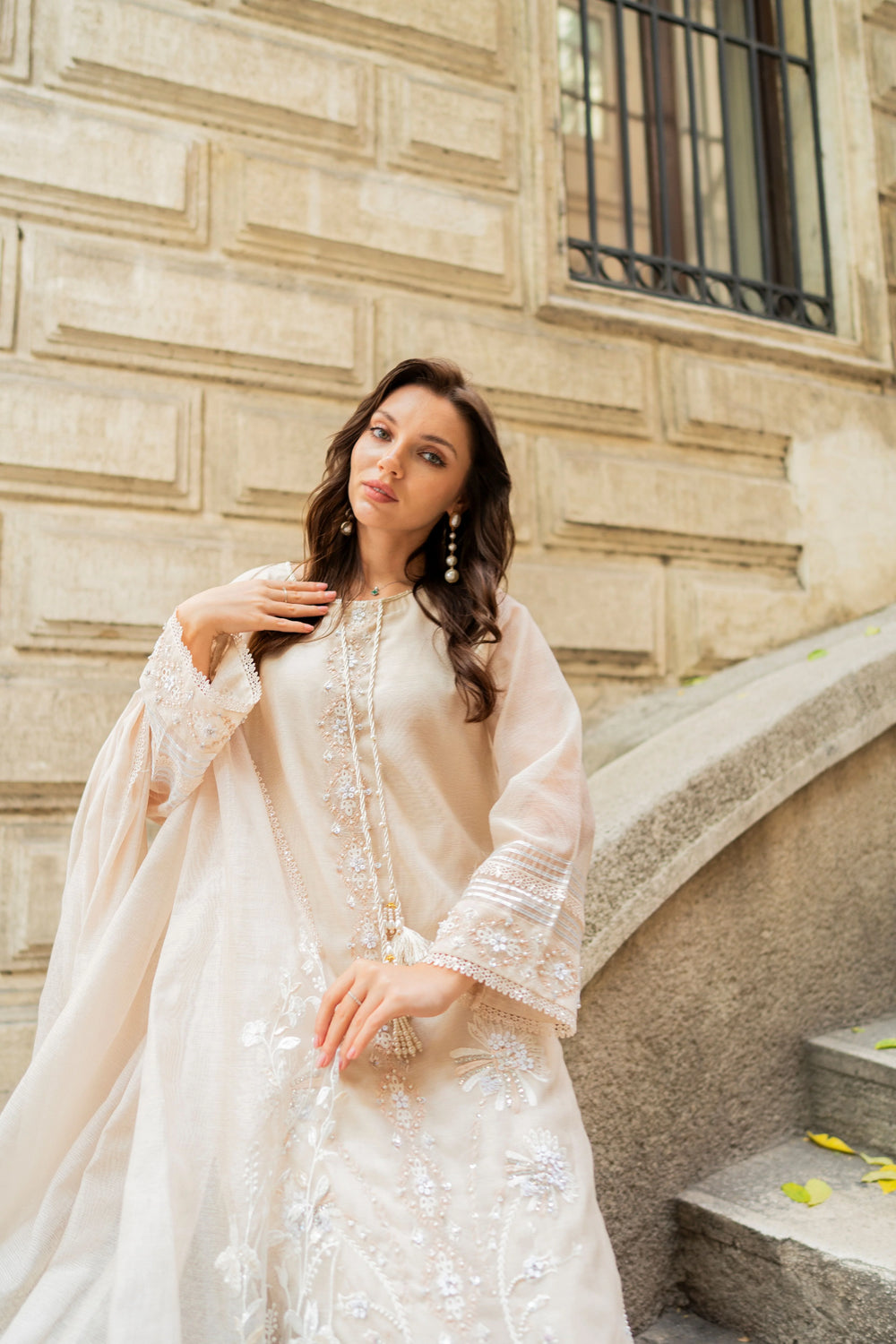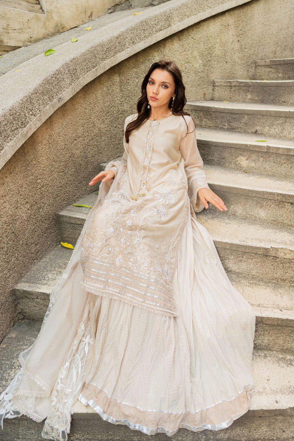 1) Pure khaddi net shirt with hand Embroidered all over work on front, back & Sleeves (dapka,nakshi ,3D,Rasham, Swarovski, pearls, sequins, etc) with daman embroidered border detailing and finished edges.