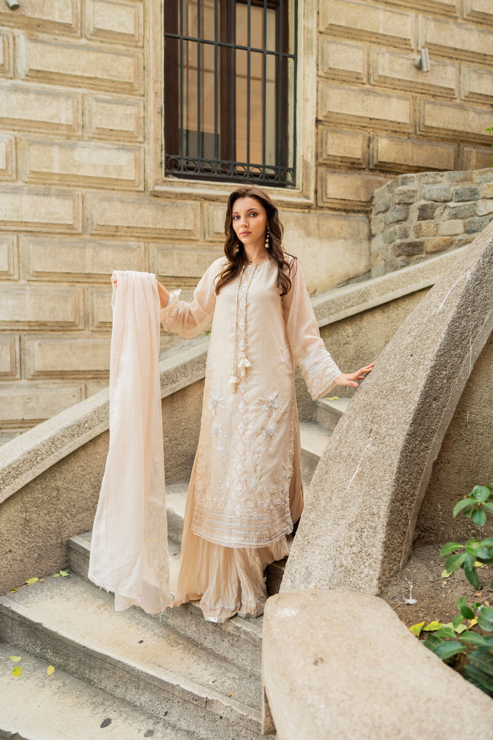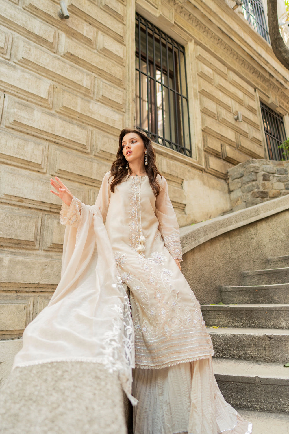 3) Soft khaddi net dupatta , embroidered border work detailing edges.Complete 3pcs Stitched (Same as Shown in pictures).