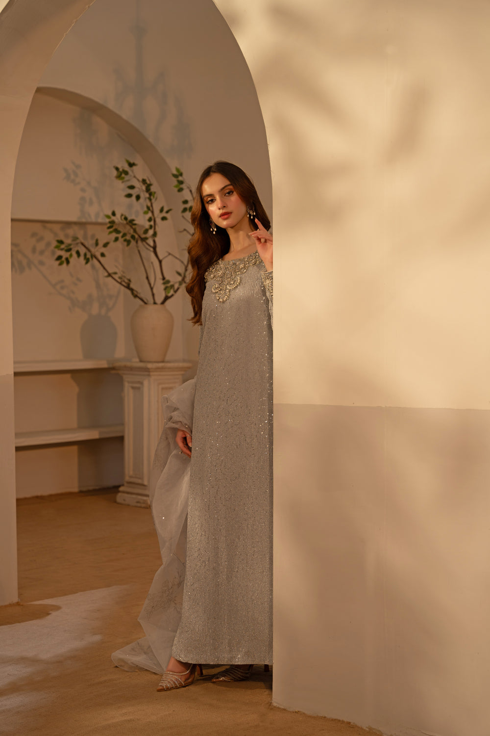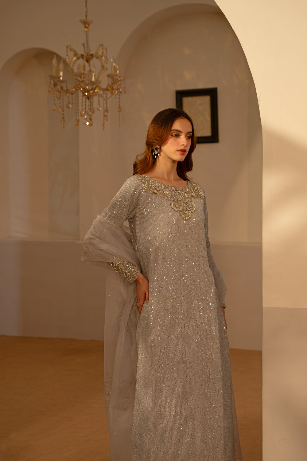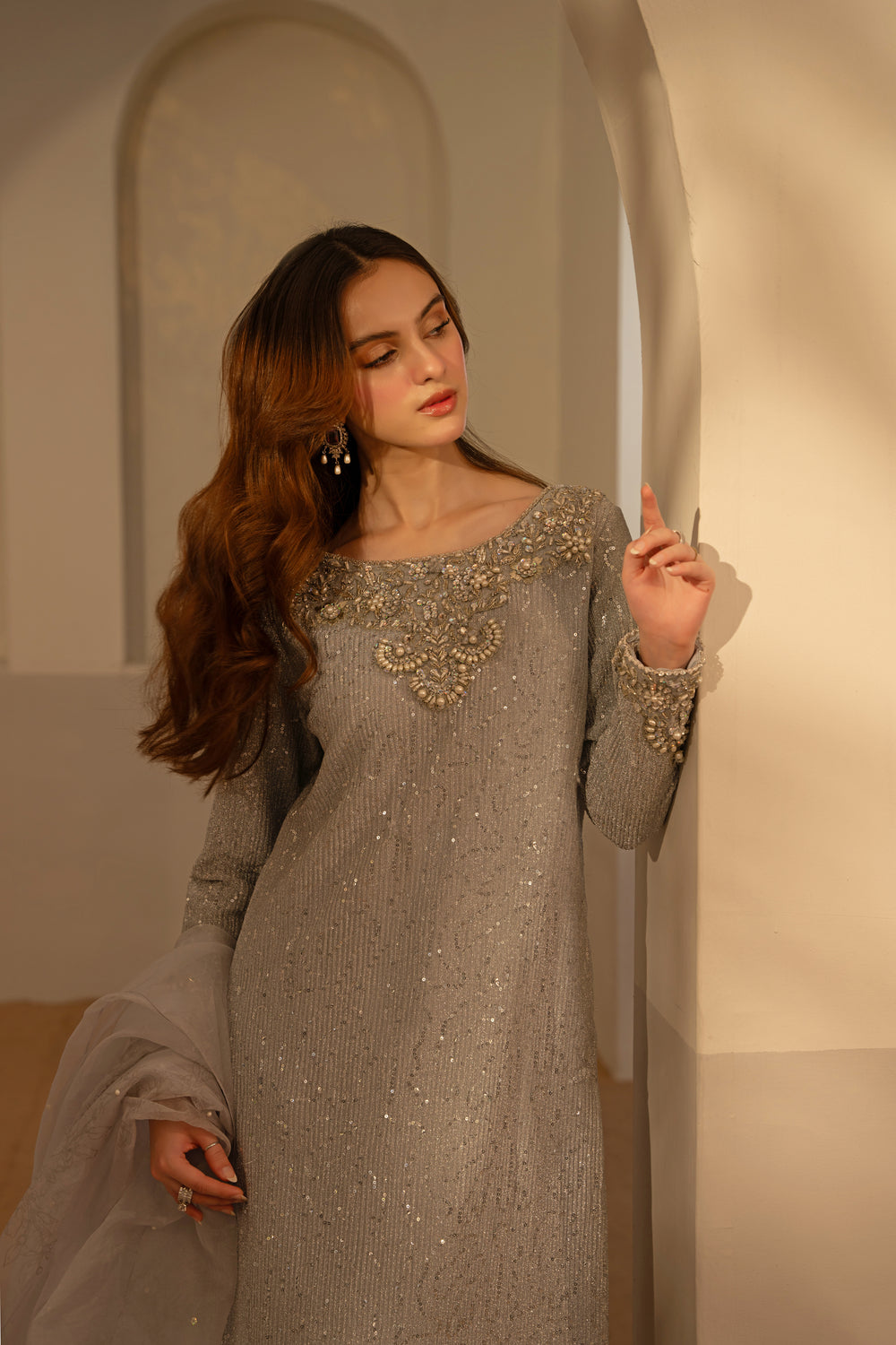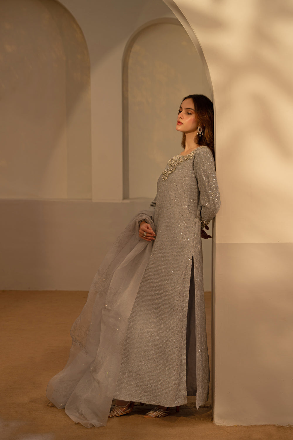 Made of moonlight, this stunning silver pre-owned long shirt has an embellished collar, lovely embalished sleeves, and intricate unaligned sequence designs all over. It is worn with trousers and finished with a dupatta with block prints.