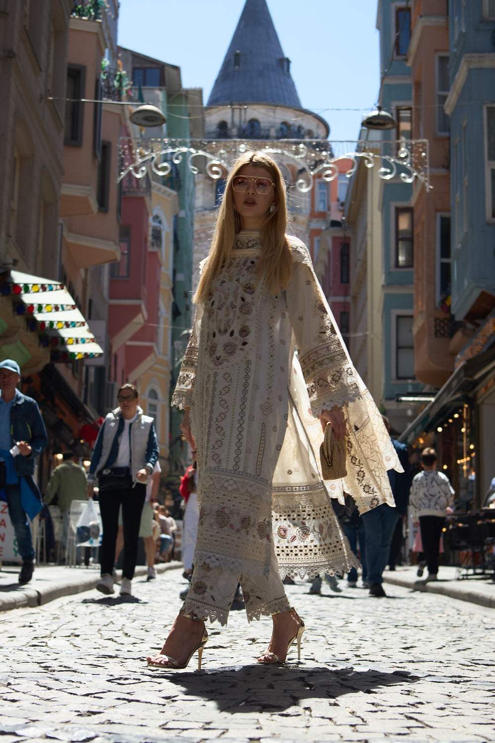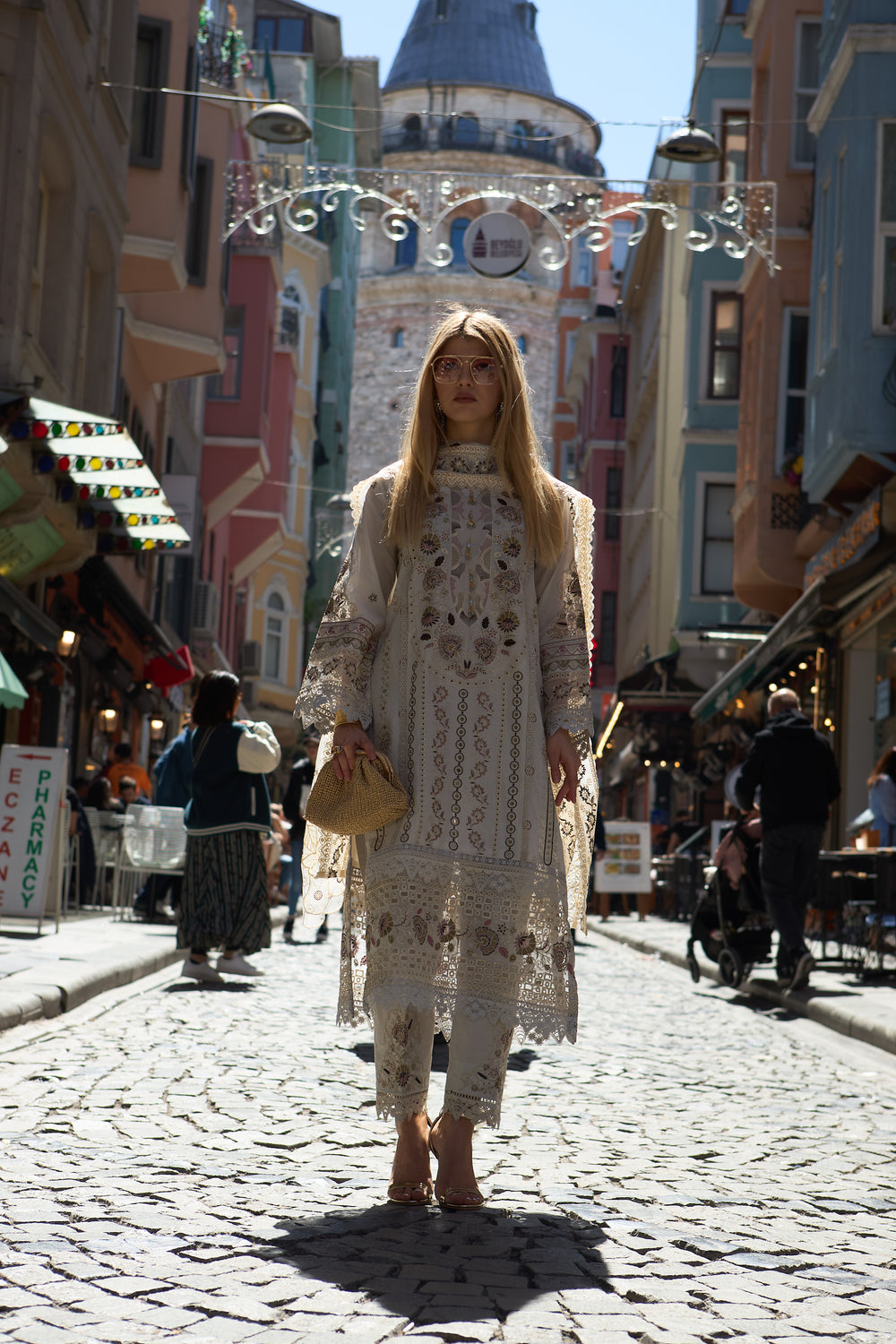 Premium Embroidered lawn 3 piece suit with chiffon dupatta and cotton trousers. Customizable in stiched or